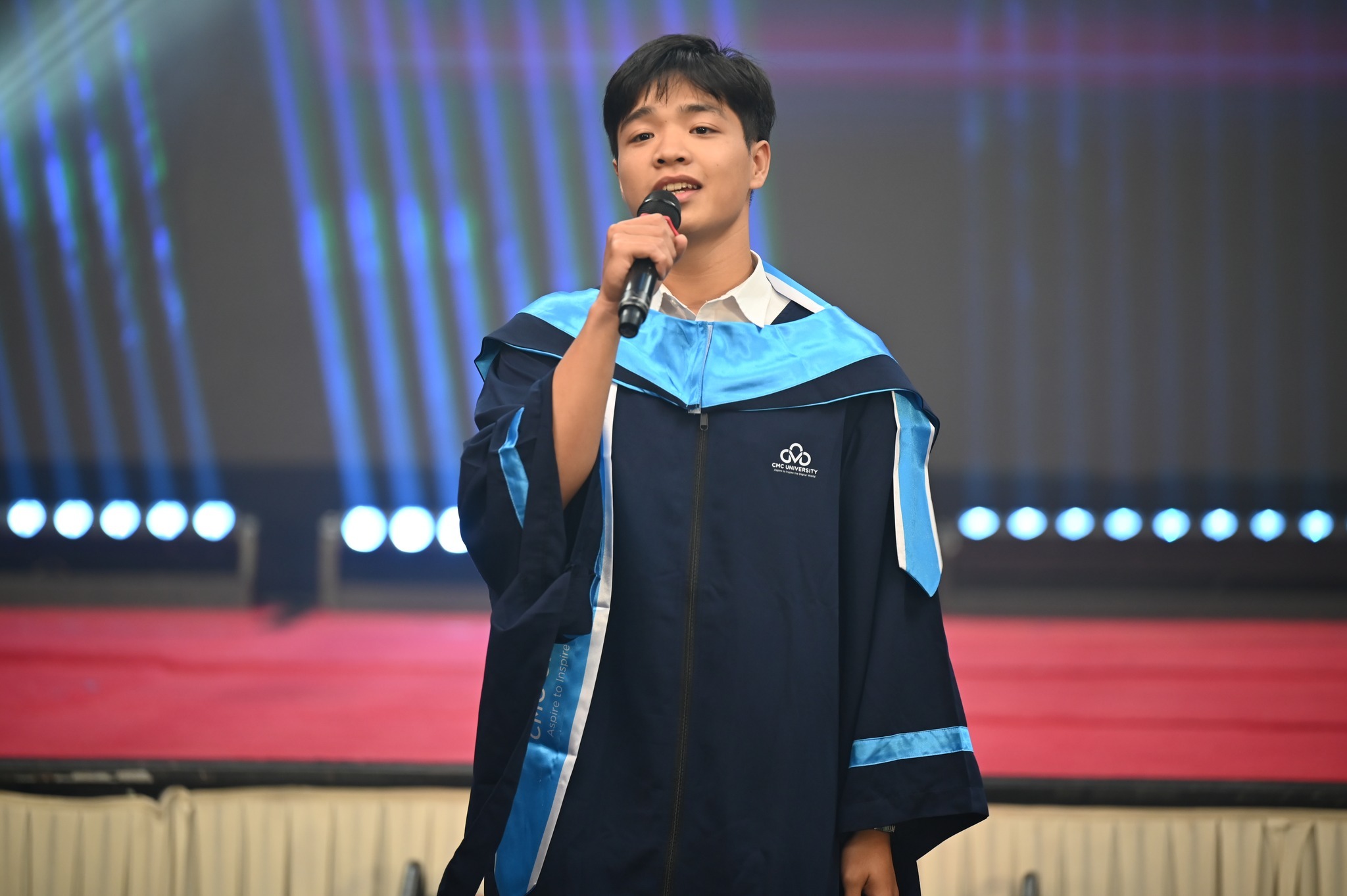 Đại diện toàn thể sinh viên Khóa 1 tốt nghiệp năm 2025, em Ngô Đức Thuận – Thủ khoa tốt nghiệp ngành Công nghệ Thông tin đã có những phát biểu đầy xúc động: “Trường Đại học CMC đã cho em môi trường để học, để thử sức và để trưởng thành. Nhìn lại hành trình 3 năm qua tại mái trường này, em nhận ra rằng mỗi khó khăn đều trở thành động lực để em bước tiếp và đạt được những kết quả ngày hôm nay. Cơ hội được thực tập và làm việc tại một trong những tập đoàn công nghệ hàng đầu Việt Nam là điều mà trước đây em chưa từng dám nghĩ đến, và cũng là minh chứng rõ ràng nhất cho hành trình trưởng thành ấy. Em xin được bày tỏ lòng biết ơn sâu sắc tới toàn thể thầy cô, cán bộ Nhà trường, gia đình và bạn bè đã luôn đồng hành, hỗ trợ trong suốt ba năm học tập”.