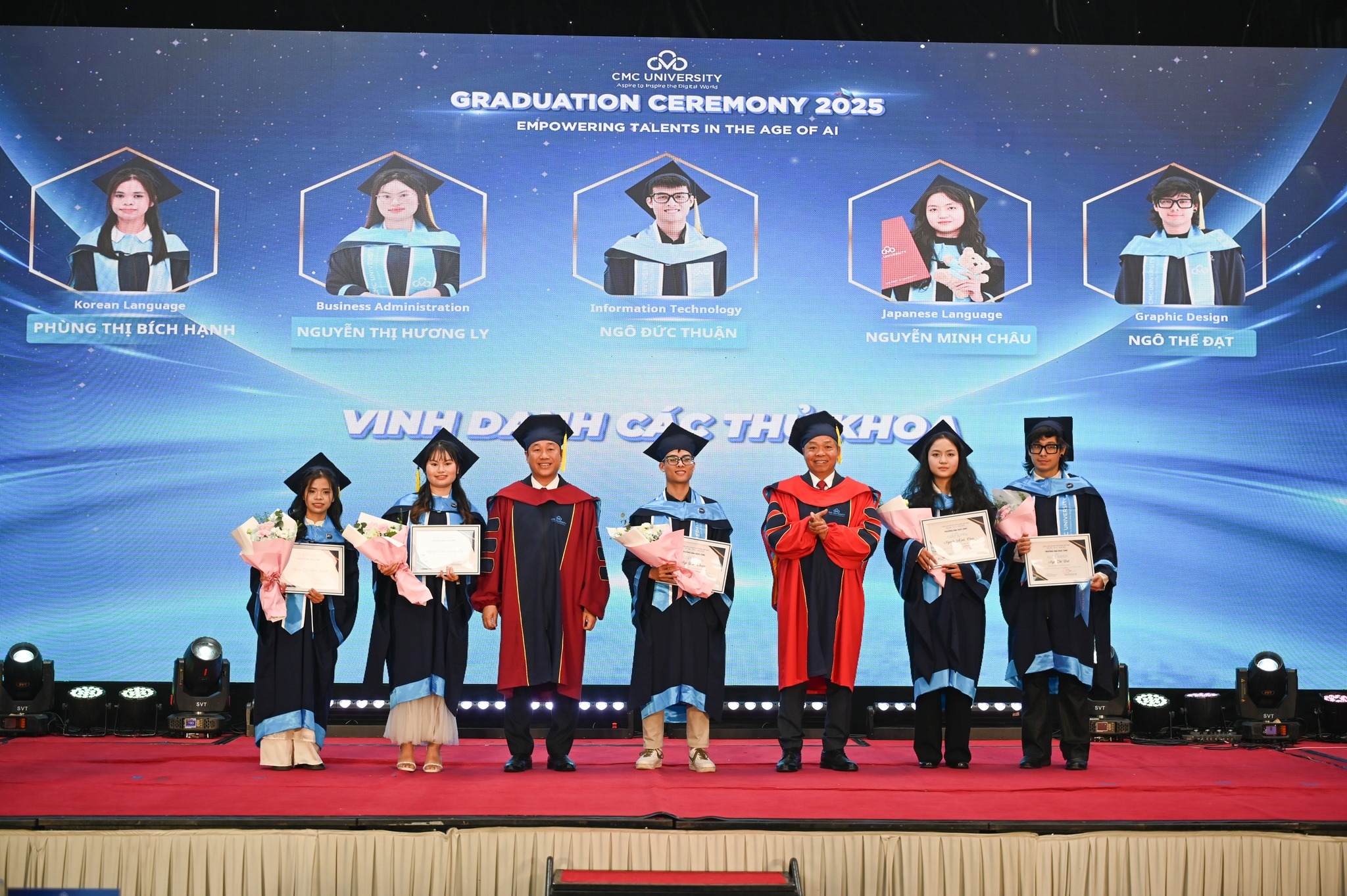 Buổi lễ đã mang đến những khoảnh khắc xúc động và đầy tự hào cho các tân cử nhân Khóa 1. Trong không khí trang trọng ấy, 5 sinh viên xuất sắc vinh dự nhận danh hiệu thủ khoa của các ngành Công nghệ Thông tin, Quản trị kinh doanh, Ngôn ngữ Nhật, Ngôn ngữ Hàn Quốc và Thiết kế Đồ họa với điểm số GPA gần như tuyệt đối.