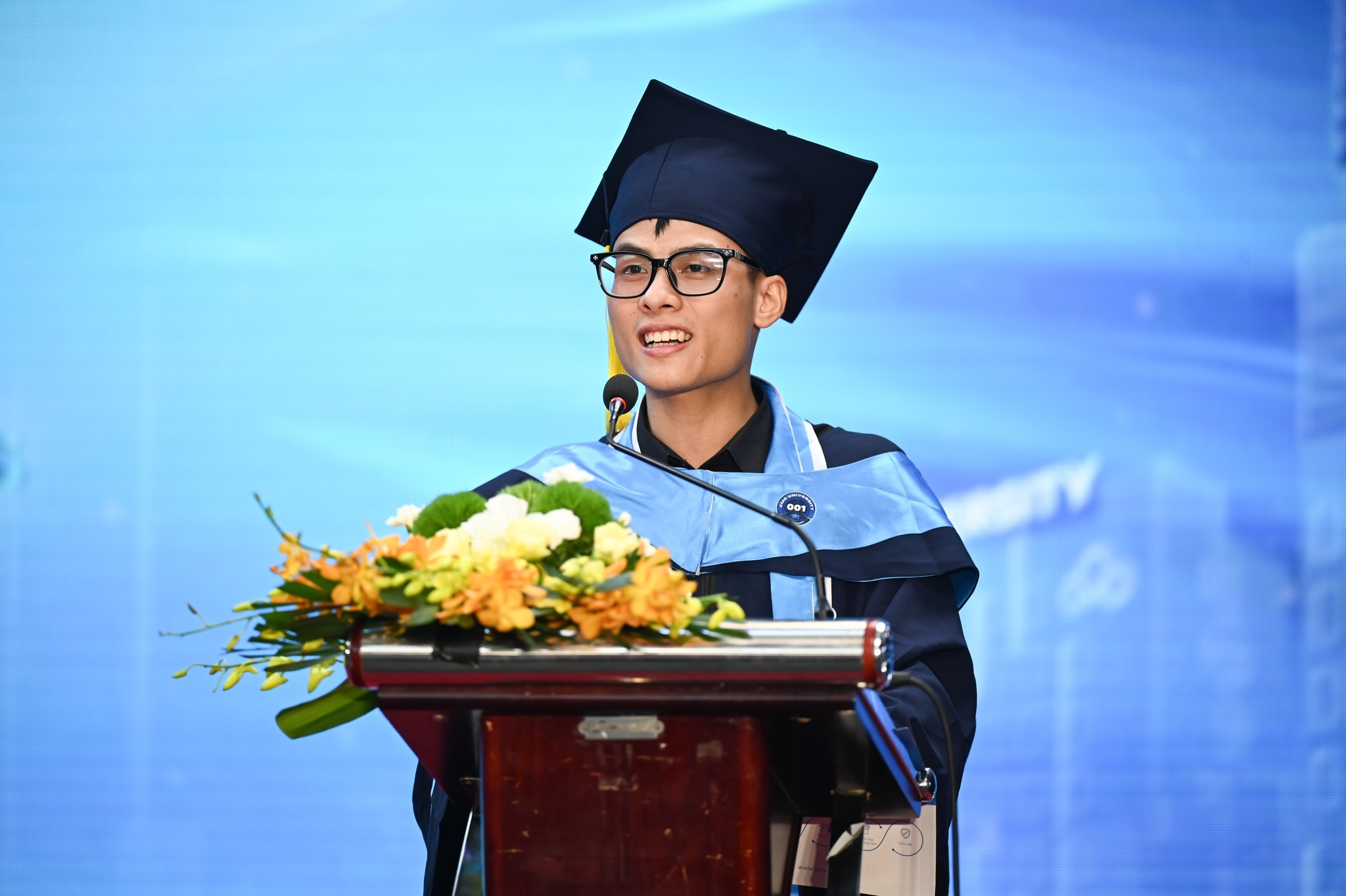 Đồng thời, Hiệu trưởng gửi lời chúc mừng tới các tân cử nhân Khóa 1 và bày tỏ niềm tự hào với thế hệ sinh viên đầu tiên của Nhà trường. Nhắn nhủ đến các tân cử nhân trước khi bước vào hành trình mới, thầy khuyến khích sinh viên hãy mạnh dạn khám phá, thử nghiệm và sẵn sàng bước ra khỏi vùng an toàn để trưởng thành. Đồng thời, thầy đề cao vai trò của sự tận tâm, đam mê và kỷ luật trong công việc và cuộc sống. Bởi chỉ khi duy trì được những giá trị này, con người mới có đủ nội lực để vượt qua những thử thách lớn trên con đường phía trước.