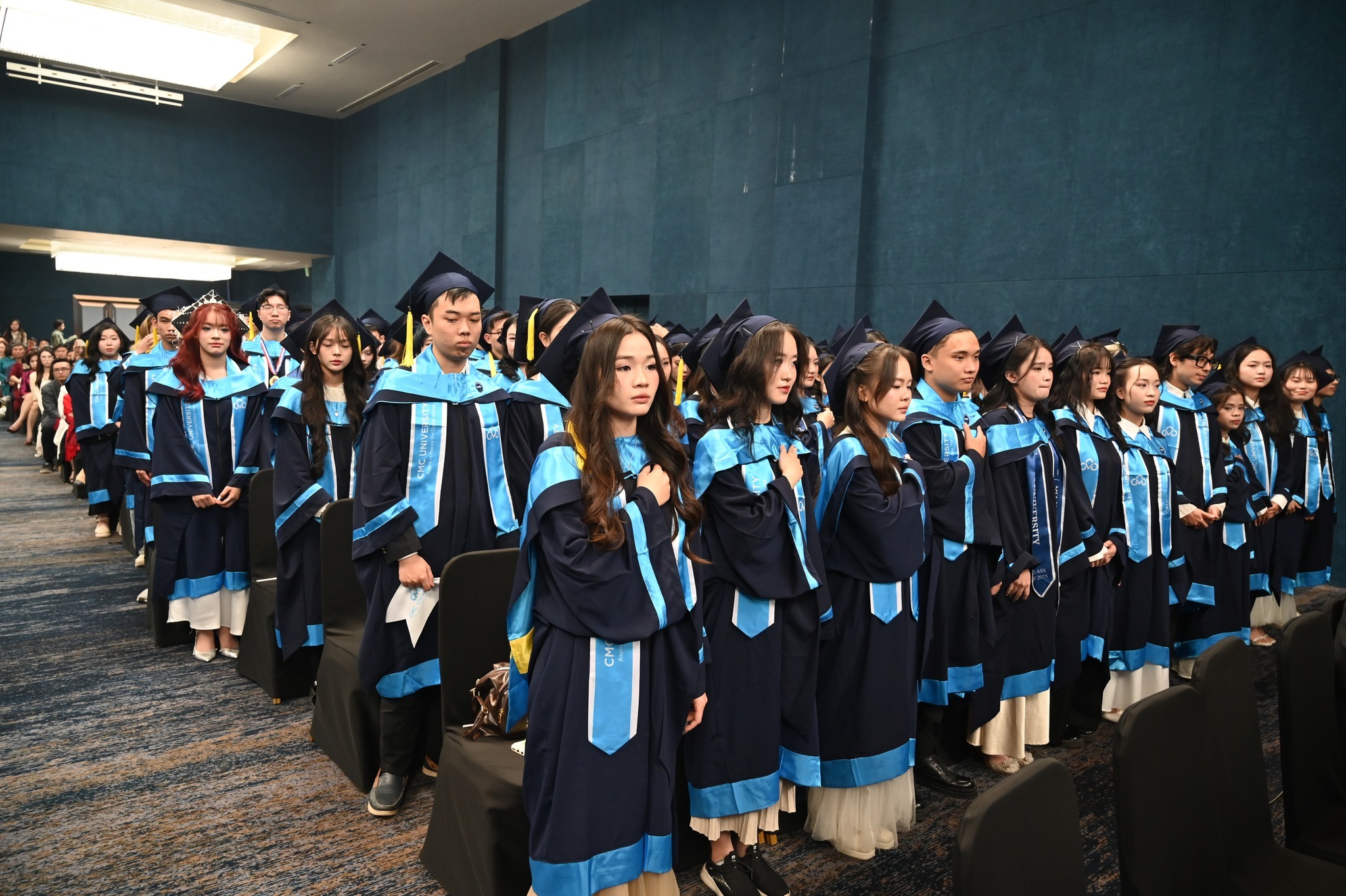 Trước khi khép lại buổi lễ, cả hội trường như vỡ òa trong giây phút những chiếc mũ cử nhân tung bay đầy tự hào. Đó là khoảnh khắc đánh dấu một khởi đầu mới, mở ra tương lai rộng lớn cho các tân cử nhân tự tin chinh phục hành trình tiếp theo với tri thức, bản lĩnh và khát vọng cống hiến.