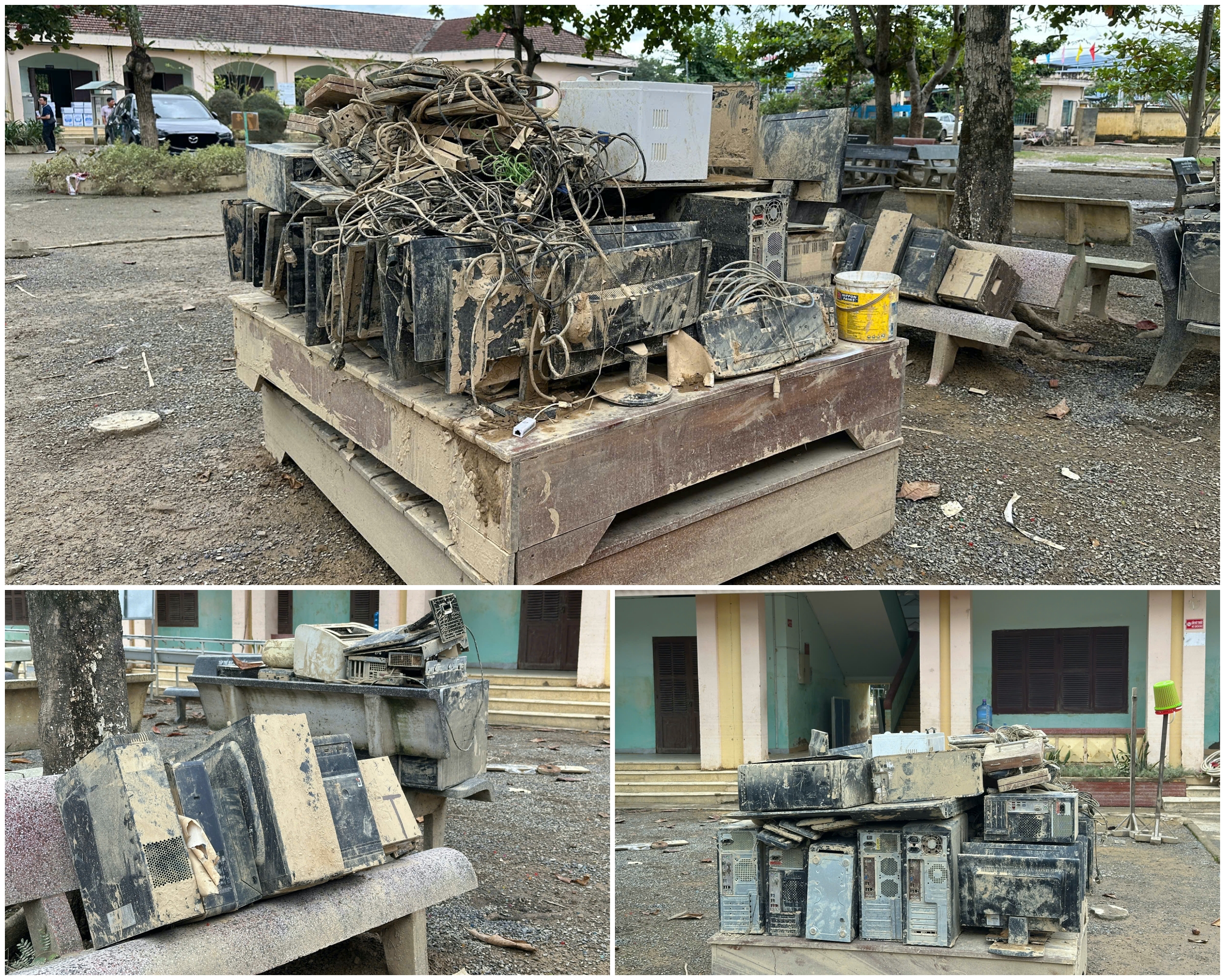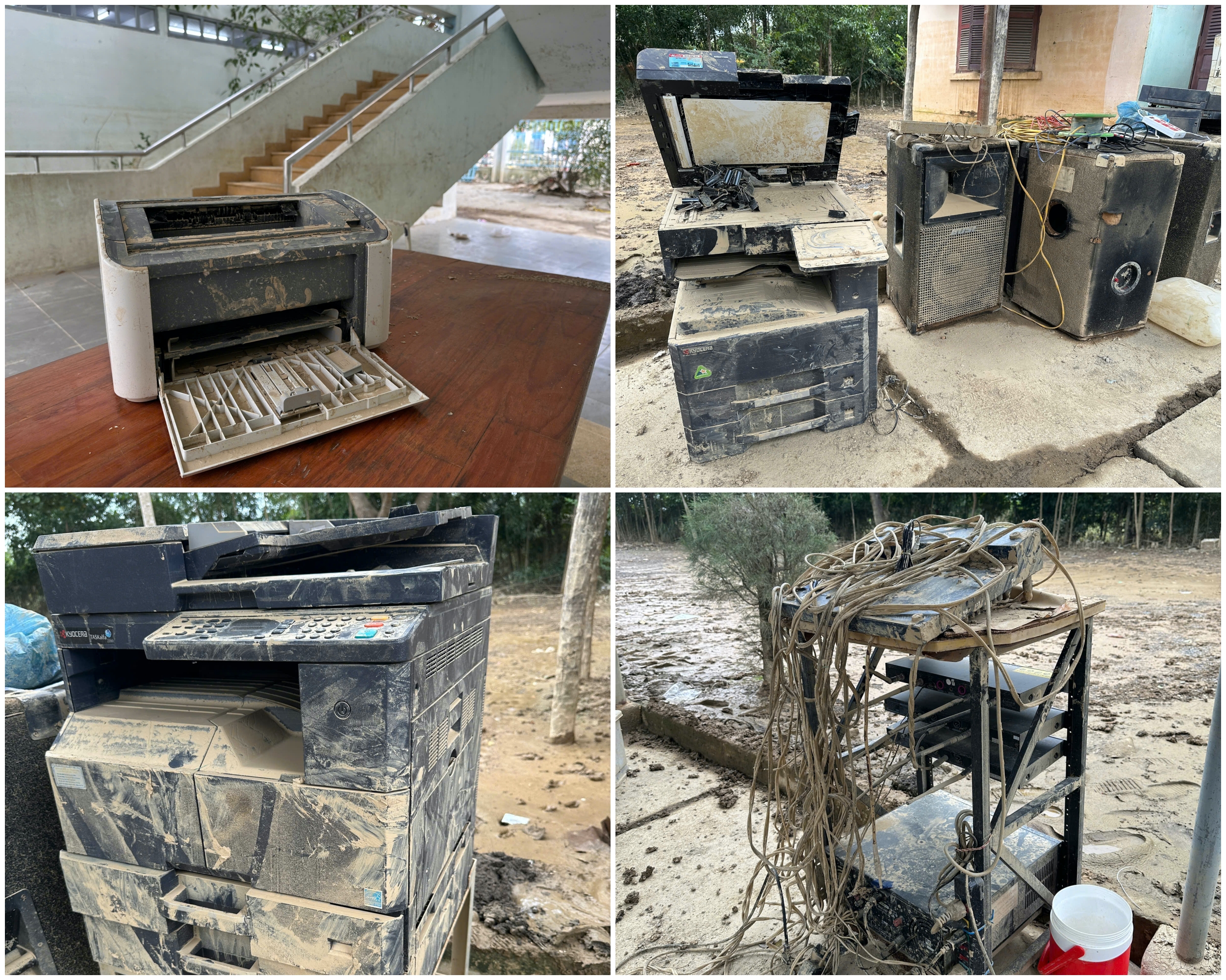 Các thiết bị điện tử như máy in, máy photo, loa đài, âm thanh bị ngập nước và bùn đất không thể sử dụng được nữa.