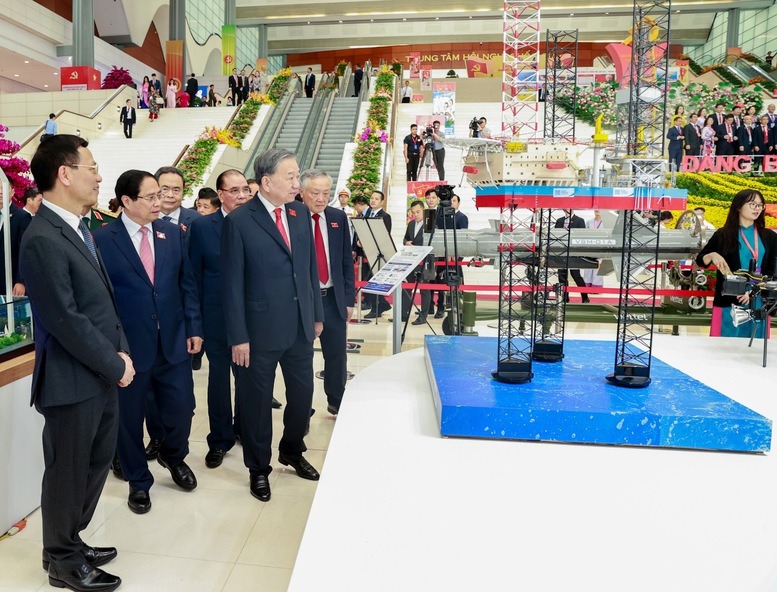 Tổng Bí thư Tô Lâm, Thủ tướng Phạm Minh Chính và các đại biểu tham quan triển lãm thành tựu khoa học công nghệ, đổi mới sáng tạo và chuyển đổi số trong khuôn khổ Đại hội - Ảnh: VGP.