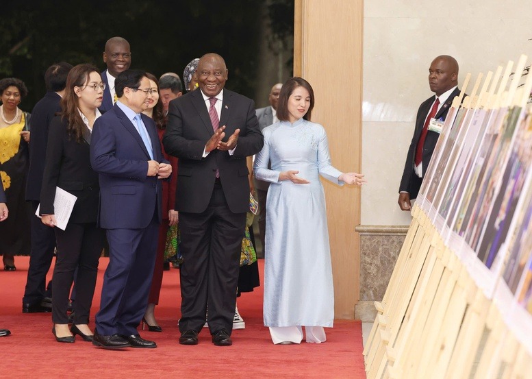 Thủ tướng Phạm Minh Chính và Tổng thống Cyril Ramaphosa tham quan trưng bày ảnh về quan hệ hợp tác Việt Nam - Nam Phi - Ảnh: VGP/Nhật Bắc.