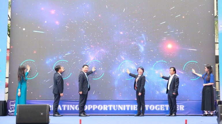 Các đại biểu bấm nút khai mạc Ngày hội việc làm Trường đại học Ngoại ngữ-ULIS Job Fair 2026