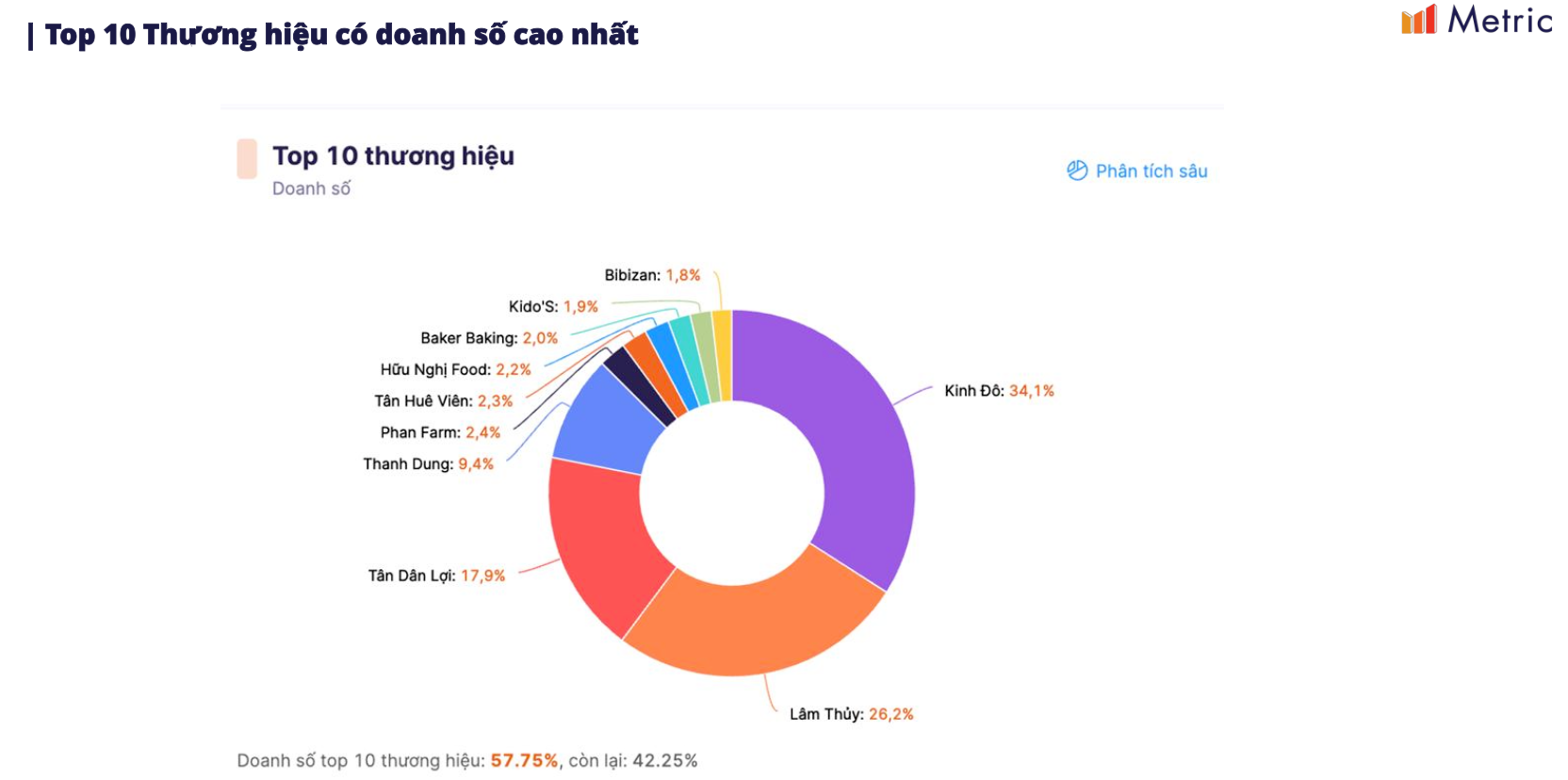 Thống kê của Metric.vn cho thấy, 10 thương hiệu đứng đầu chiếm gần 60% tổng doanh thu bánh trung thu trực tuyến. Trong đó, Kinh Đô áp đảo với 34,1%, theo sau là Lâm Thủy (26,2%), Tân Dân Lợi (17,9%) và Thanh Dung (9,4%). Các thương hiệu còn lại như Phan Farm, Tân Huê Viên, Hữu Nghị Food, Baker Baking, Kido’s và Bibizan chỉ chiếm dưới 3% thị phần mỗi đơn vị.