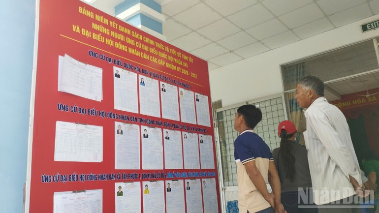Cử tri trên địa bàn xã Tân Phước 1, tỉnh Đồng Tháp xem lại danh sách và tiểu sử người ứng cử trước khi lựa chọn vào phiếu bầu của mình.