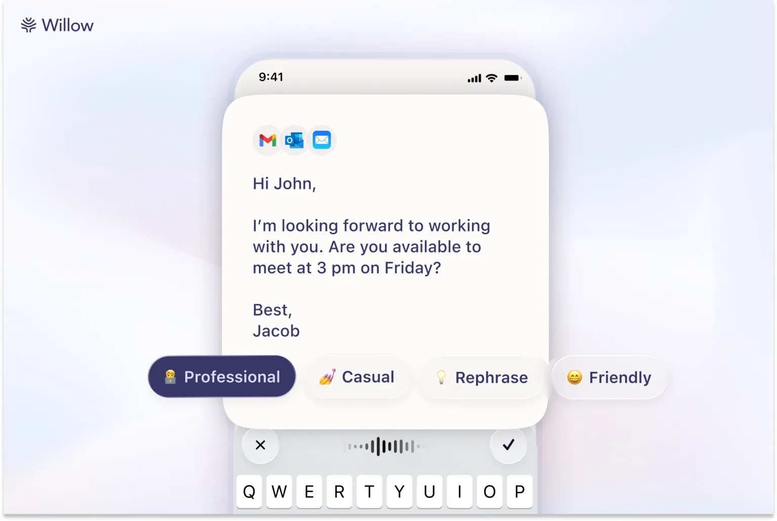 Willow tự quảng bá là công cụ tiết kiệm thời gian dành cho những người không thích gõ phím. Ngoài các tính năng phổ biến như chỉnh sửa và định dạng tự động, Willow còn sử dụng mô hình ngôn ngữ lớn để tạo ra cả một đoạn văn hoàn chỉnh chỉ từ vài từ được đọc.