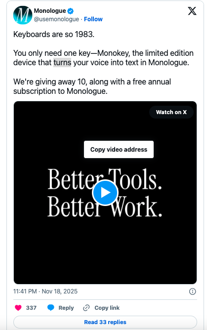 Monologue cho phép ghi miễn phí 1.000 từ mỗi tháng. Gói trả phí có giá 10 USD/tháng hoặc 100 USD/năm. Đặc biệt, nếu trở thành một trong những người dùng tích cực nhất, bạn còn có thể nhận được chiếc “Monokey” độc đáo để sử dụng cùng ứng dụng.