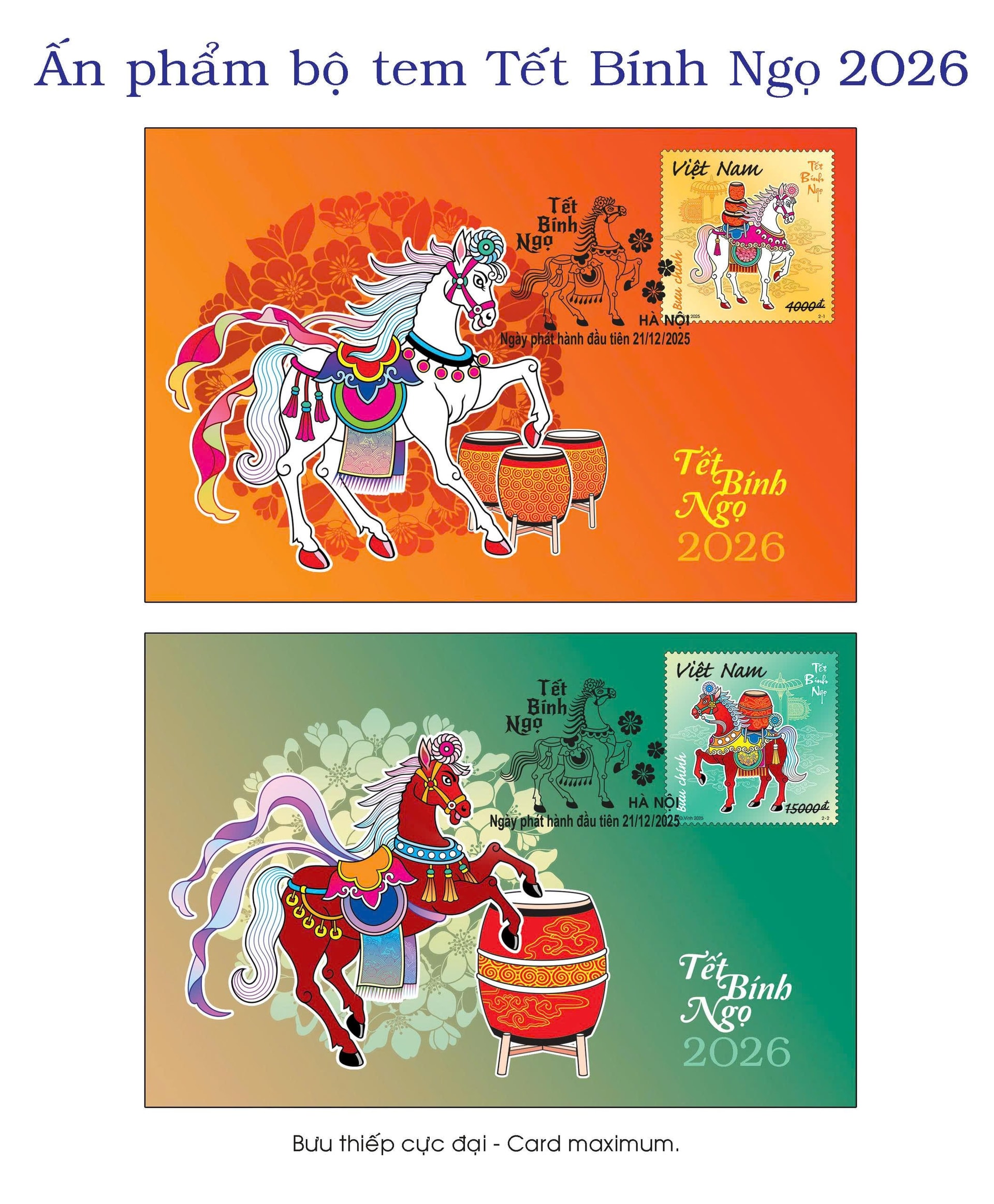 Hai mẫu tem bộ tem Tết Bính Ngọ 2026 mang thông điệp "Mã đáo thành công".