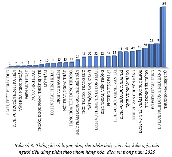 Bức tranh tiêu dùng năm 2025 tiếp tục cho thấy thương mại điện tử chiếm tỷ trọng phản ánh cao nhất với 191 đơn thư phản ánh (chiếm 21,3%) tổng số đơn. Điều này phản ánh mức độ phổ biến mạnh mẽ của hình thức mua sắm trực tuyến trong đời sống hiện đại, nhưng cũng cho thấy những rủi ro vẫn tồn tại trên môi trường số.