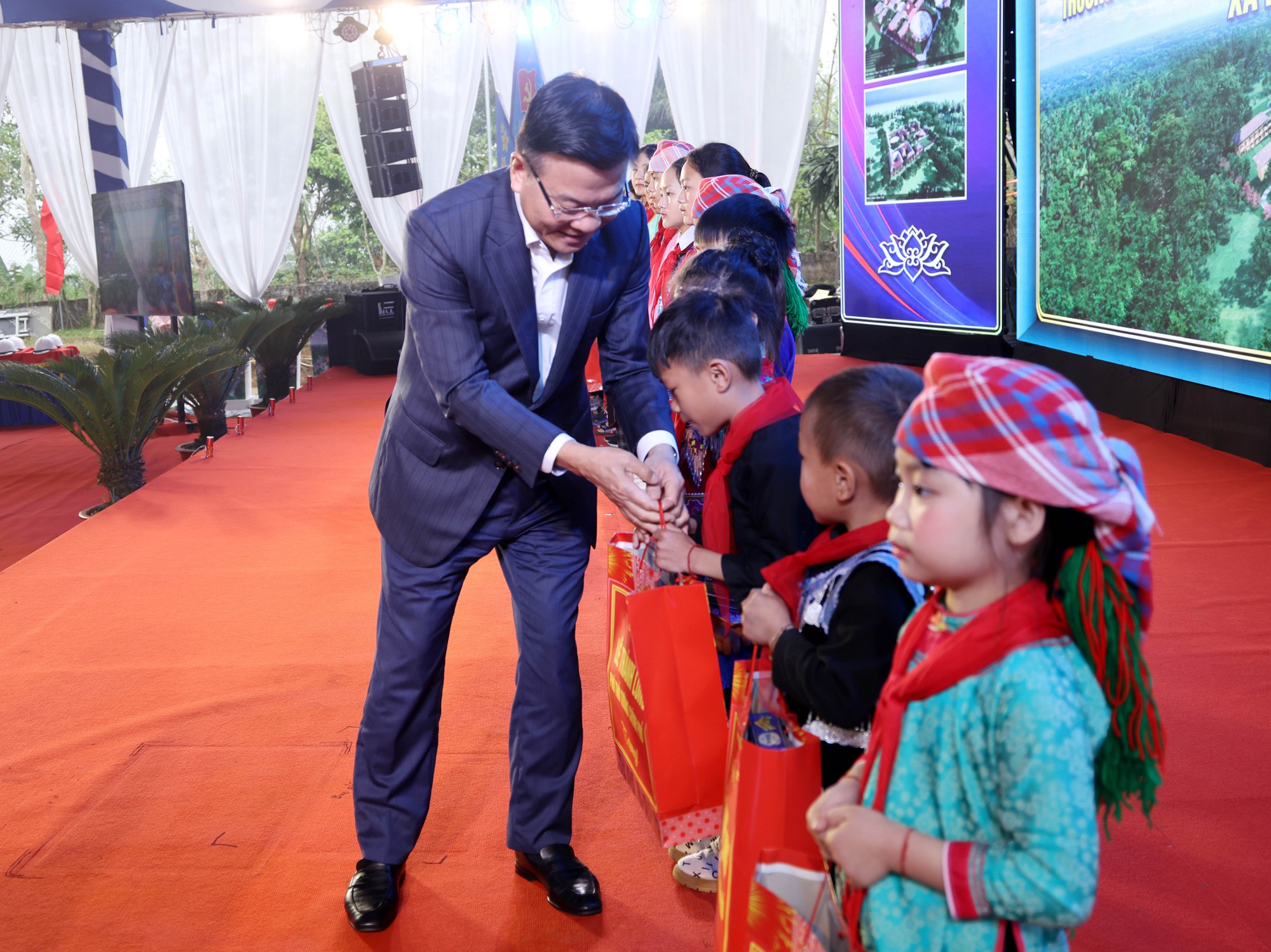 Phó Thủ tướng Chính phủ Lê Thành Long cùng các em học sinh, lãnh đạo bộ, ngành, địa phương thực hiện nghi thức khởi công, động thổ Trường phổ thông nội trú Tiểu học và Trung học cơ sở Bản Lầu - Ảnh: VGP/Đức Tuân