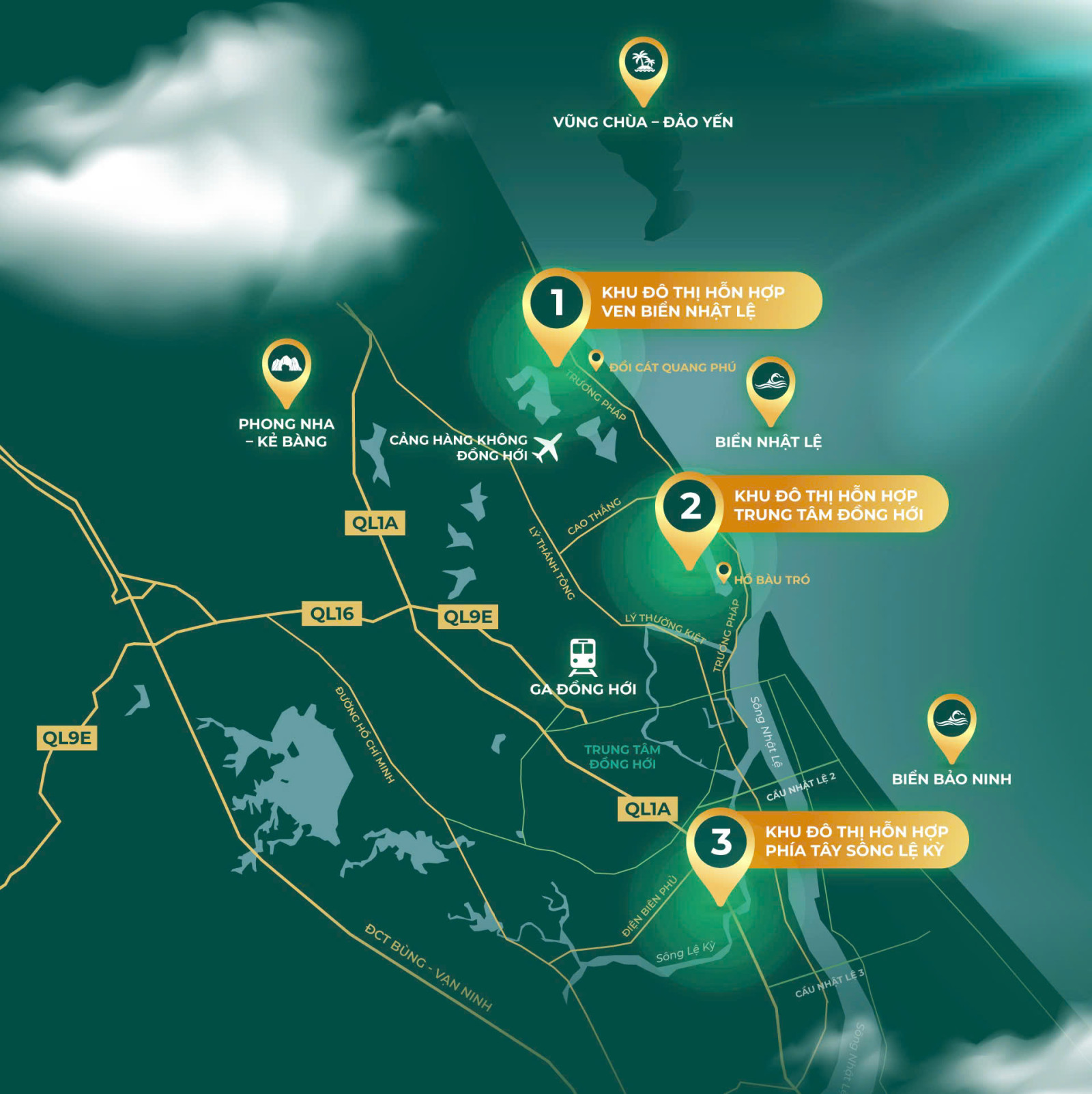 Về vị trí, cả ba dự án đều tọa lạc tại những khu vực trung tâm, là tâm điểm của các tọa độ giao thông, tọa độ du lịch: cận biển, kề sông, trung tâm đô thị và trung tâm của “tam giác du lịch”: Phong Nha - Kẻ Bàng, Vũng Chùa - Đảo Yến và Nhật Lệ - Bảo Ninh.
