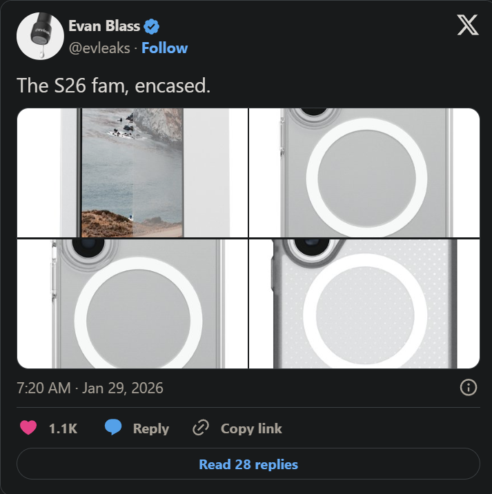 Nguồn tin rò rỉ nổi tiếng Evan Blass vừa chia sẻ loạt hình ảnh trên mạng xã hội X, hé lộ thiết kế quen thuộc của dòng Galaxy S26. Các hình ảnh cho thấy mặt trước của Galaxy S26 Ultra cùng mặt lưng của cả ba mẫu máy, tất cả đều được đặt trong ốp lưng trong suốt của hãng UAG – một thương hiệu phụ kiện uy tín.