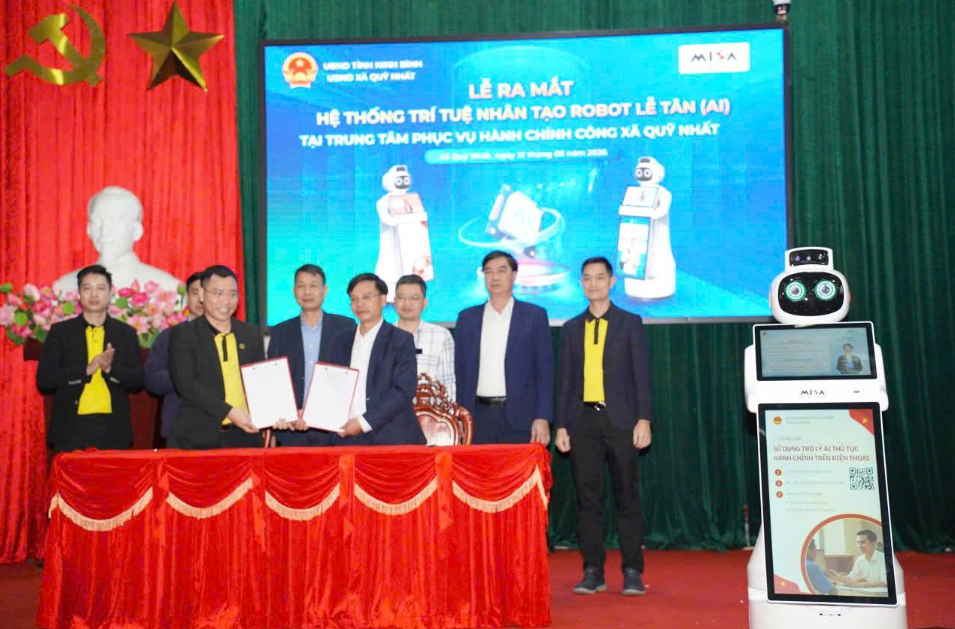 Xã Quỹ Nhất, Ninh Bình đã trở thành điểm sáng khi phối hợp với Tập đoàn MISA tổ chức Lễ ra mắt Hệ thống AI Robot Lễ tân tại Trung tâm Phục vụ hành chính công xã.