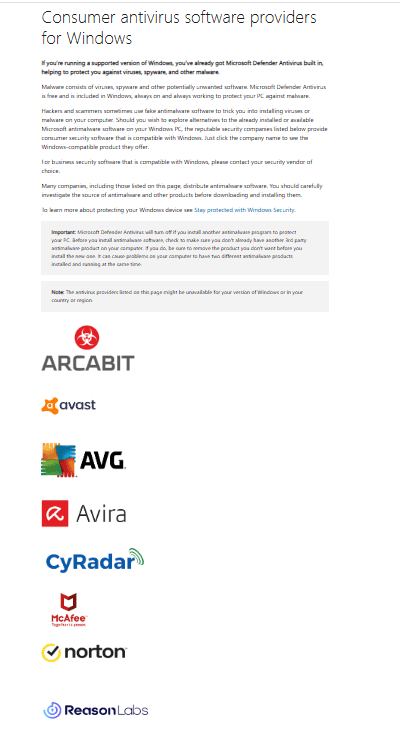 Danh sách các nhà cung cấp phần mềm chống mã độc dành cho người dùng Windows do Microsoft công bố.