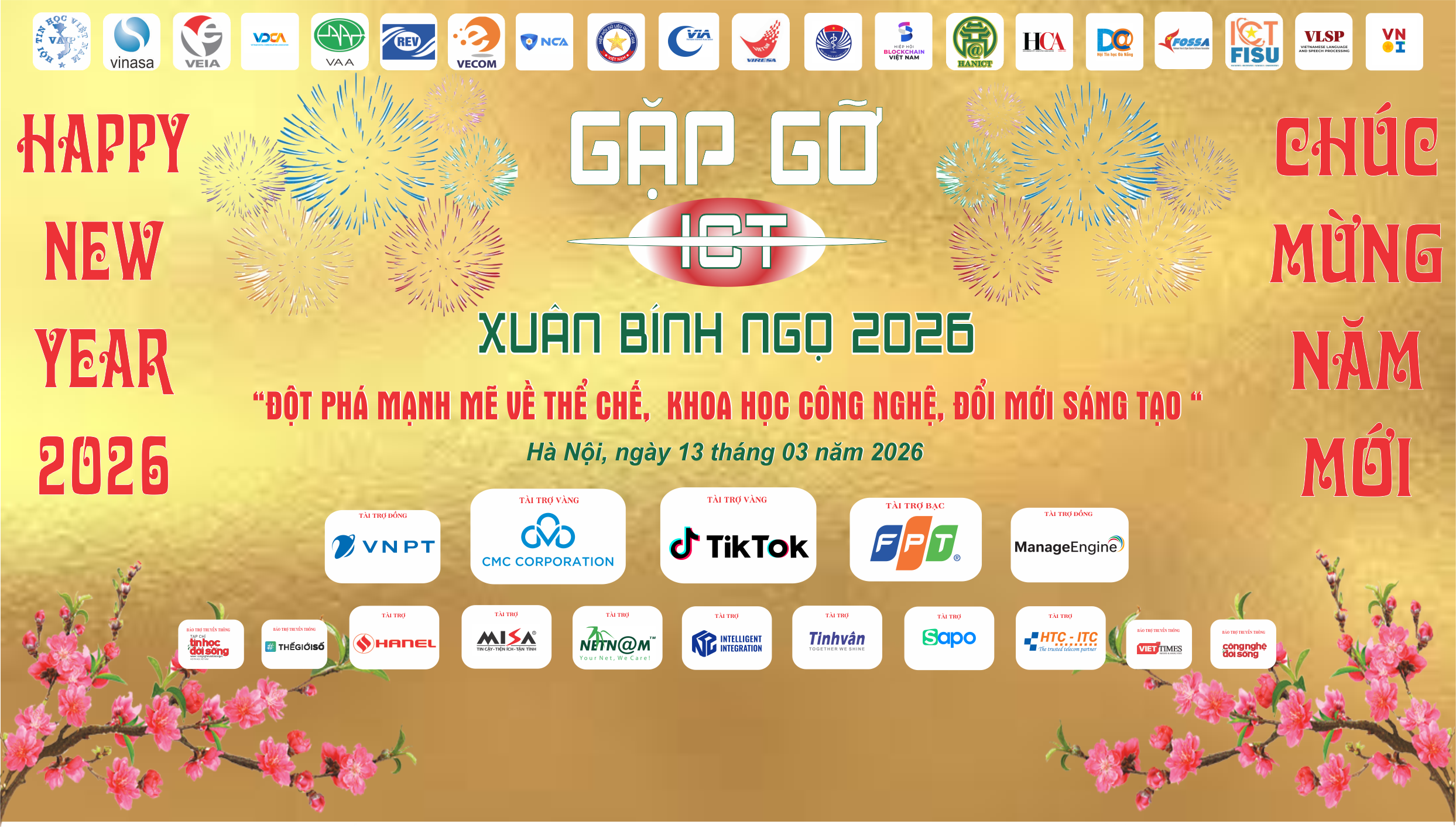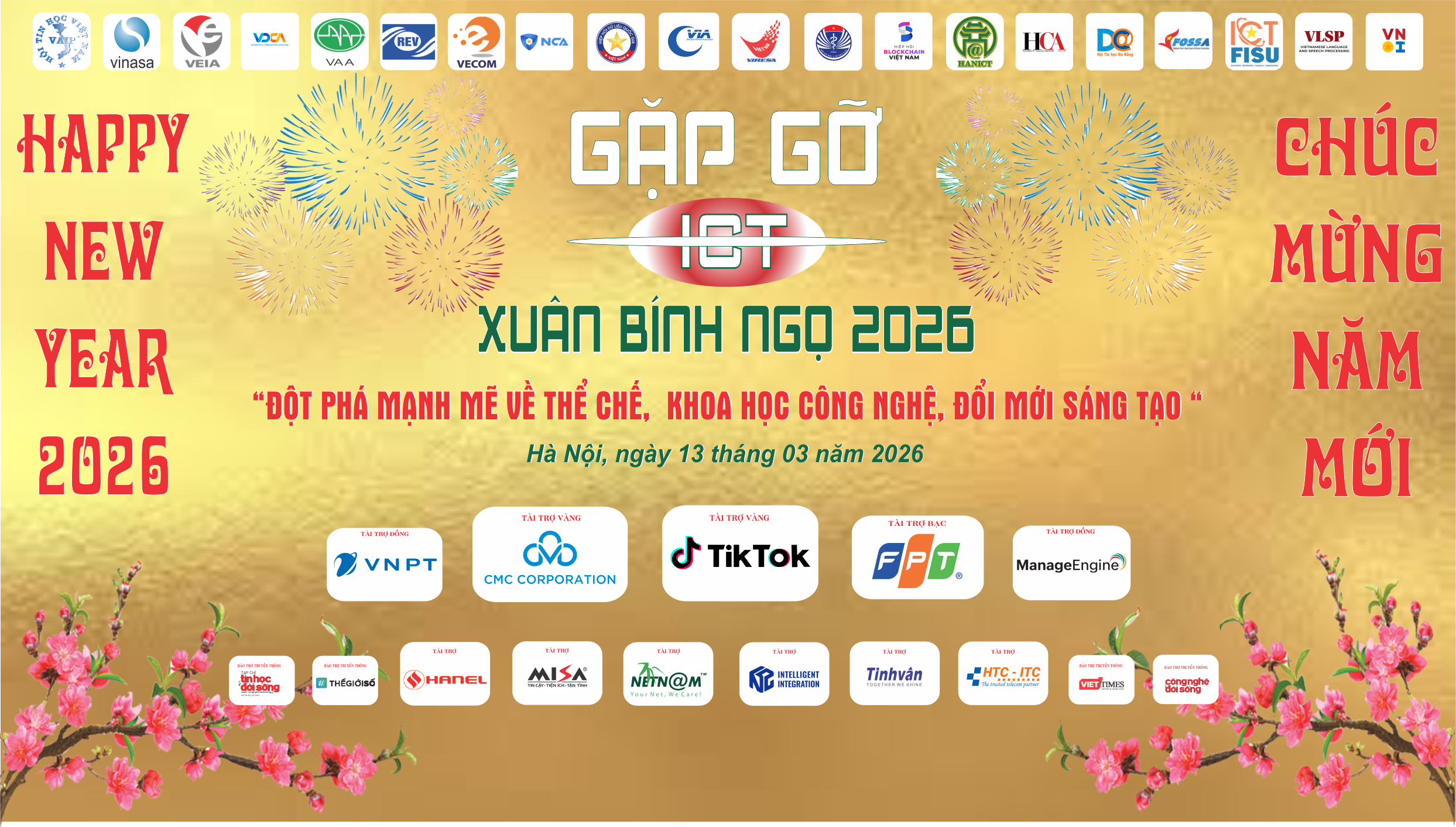 Chương trình Gặp gỡ ICT Xuân Bính Ngọ 2026 do 20 tổ chức xã hội nghề nghiệp đồng tổ chức: Hội Tin học Việt Nam, Hội Vô tuyến Điện tử Việt Nam, Hội Truyền thông số Việt Nam, Hiệp hội Doanh nghiệp phần mềm và Dịch vụ CNTT Việt Nam, Hiệp hội Doanh nghiệp điện tử Việt Nam, Hiệp hội Internet Việt Nam, Hội Tự động hóa Việt Nam, Hiệp hội Thương mại Điện tử Việt Nam, Hiệp hội An toàn Thông tin Việt Nam, Hội Thể thao và Giải trí điện tử Việt Nam, Hội Tin học Y Tế Việt Nam, Hiệp hội Blockchain Việt Nam, Hiệp hội An ninh mạng Quốc gia, CLB Phần mềm tự do nguồn mở Việt Nam, CLB các Khoa - Viện - Trường CNTT-TT Việt Nam, CLB Xử lý ngôn ngữ và Tiếng nói tiếng Việt, CLB Olympic Tin học Việt Nam, Hội Tin học - Viễn thông Hà Nội, Hội Tin học TP HCM, Hội Tin học Đà Nẵng.