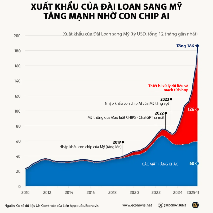 Trong bối cảnh đó, Đài Loan trở thành nguồn cung quan trọng cho cơn sốt AI tại Mỹ. Diễn biến này góp phần thúc đẩy thặng dư thương mại của Đài Loan tăng mạnh, đặc biệt với Mỹ và các nhóm hàng liên quan AI.