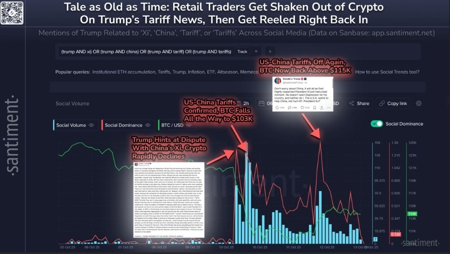 Trong sự kiện mới nhất, các cuộc bàn luận về tiền điện tử tập trung nhiều vào chính sách thương mại của ông Donald Trump, và tâm lý bi quan của nhà đầu tư nhỏ lẻ được ghi nhận ở mức cao nhất từ đầu năm, theo nhà phân tích Brian Q của Santiment.