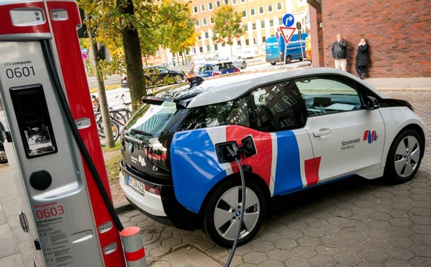 Xe ô tô điện tại một trạm sạc ở TP Hamburg, Đức. Ảnh: DPA