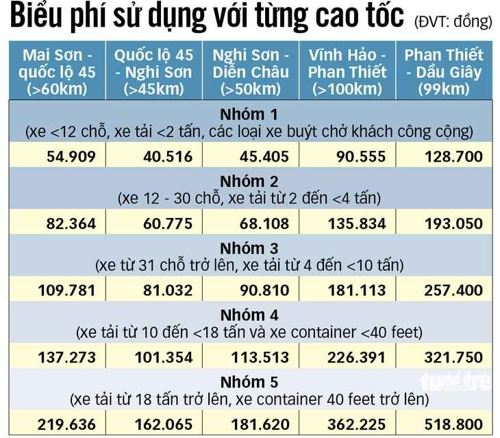 Tuy nhiên, các tuyến Mai Sơn - quốc lộ 45, quốc lộ 45 - Nghi Sơn, Nghi Sơn - Diễn Châu, Vĩnh Hảo - Phan Thiết là cao tốc 4 làn xe hạn chế (4 làn chạy xe, mỗi làn rộng 3,5m, không có làn dừng xe khẩn cấp liên tục) sẽ có mức phí 900 đồng/PCU/km.