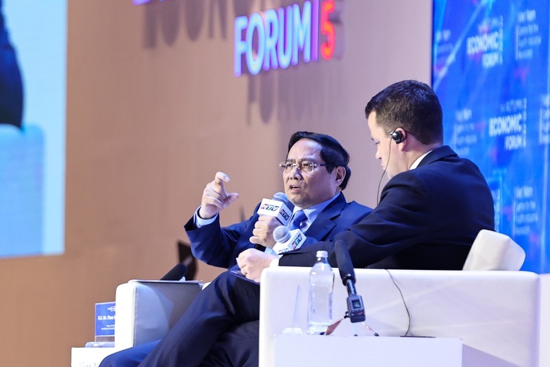 Trong câu hỏi thứ ba, điều phối viên đề nghị Thủ tướng chia sẻ về vai trò của chuyển đổi kép (chuyển đổi số, chuyển đổi xanh) đối với Việt Nam.