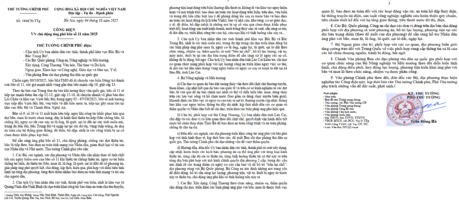 Phó Thủ tướng Trần Hồng Hà vừa ký Công điện số 186/CĐ-TTg ngày 4/10/2025 của Thủ tướng Chính phủ yêu cầu các bộ, ngành, địa phương và Nhân dân chủ động triển khai các biện pháp ứng phó khẩn cấp với bão số 11 – cơn bão được đánh giá có diễn biến phức tạp, nguy cơ gây ra “thiên tai chồng thiên tai” tại khu vực Bắc Bộ và Bắc Trung Bộ...