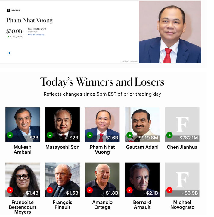 Theo dữ liệu cập nhật mới nhất từ tạp chí Forbes tính đến cuối ngày 16/4/2026, khối tài sản của Chủ tịch Hội đồng quản trị Tập đoàn Vingroup Phạm Nhật Vượng đã chạm mốc 30,9 tỉ USD. Chỉ trong vòng 24 giờ, giá trị tài sản ròng của ông đã tăng thêm 1,7 tỉ USD, giúp ông chính thức vươn lên vị trí thứ 77 trong danh sách những người giàu nhất hành tinh.