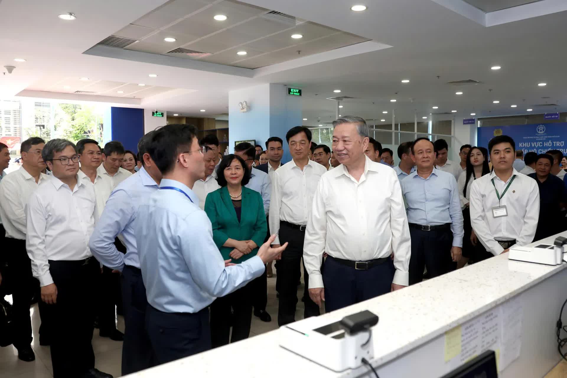 Tổng Bí thư Tô Lâm và các đồng chí lãnh đạo Đảng, Nhà nước, thành phố Hà Nội kiểm tra công tác vận hành mô hình chính quyền 2 cấp tại một số phường, xã của Thủ đô ngày 1/7/2025.