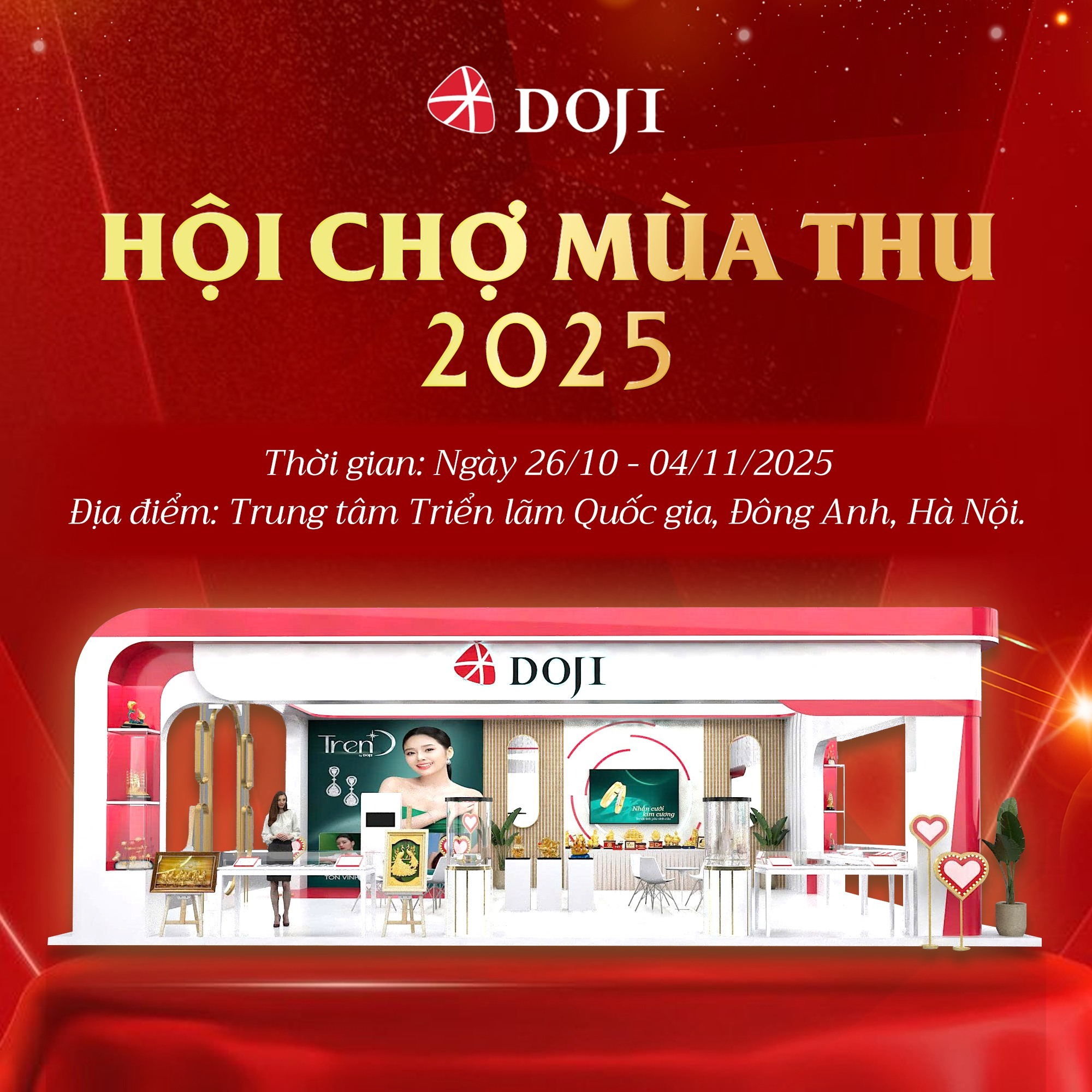 Từ ngày 26/10 - 04/11/2025, sự kiện Hội chợ Mùa thu 2025 sẽ diễn ra tại Trung tâm Triển lãm Quốc gia, Đông Anh, Hà Nội, sự kiện nhằm quảng bá nội lực sản xuất, kinh doanh, kích cầu tiêu dùng trong nước, thúc đẩy xuất, nhập khẩu và hội nhập kinh tế quốc tế. Gian hàng của trang sức DOJI là một trong những gian hàng được chờ đợi nhất, đặc biệt là trong những ngày tháng cuối của năm 2025, thời điểm được coi là mùa cưới trong năm.