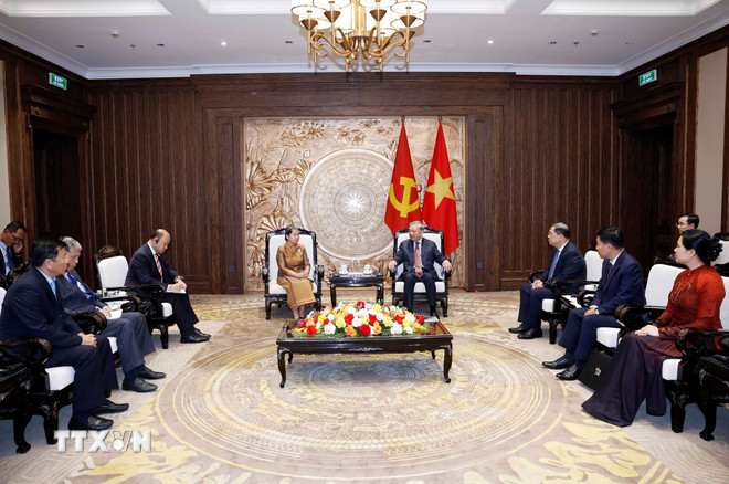 Tổng Bí thư Tô Lâm tiếp bà Men Sam An, Phó Chủ tịch Đảng Nhân dân Campuchia, Chủ tịch Hội đồng Quốc gia Mặt trận Đoàn kết Phát triển Tổ quốc Campuchia - Ảnh: TTXVN