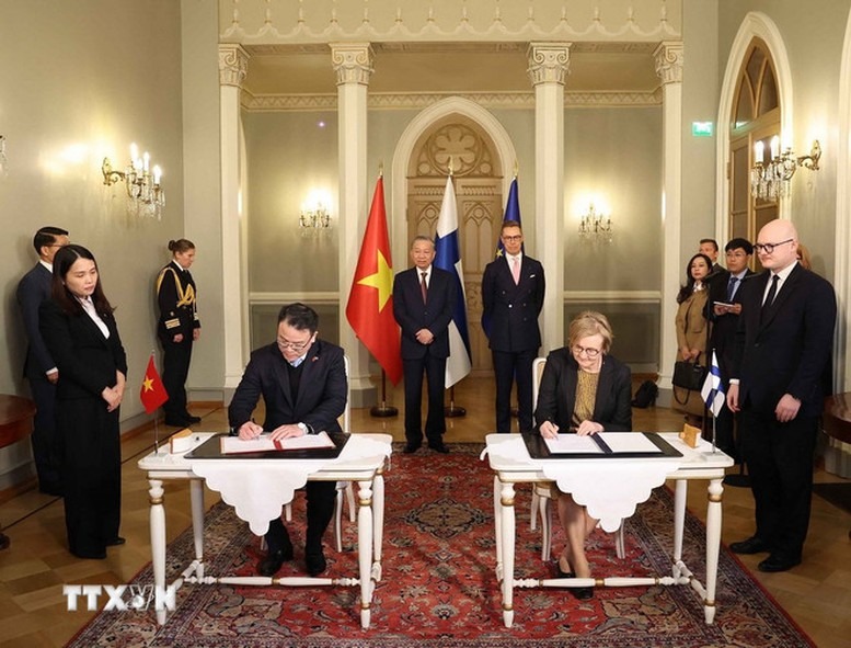 Trong khuôn khổ chuyến thăm chính thức của Tổng Bí thư Tô Lâm và Phu nhân cùng Đoàn đại biểu cấp cao Việt Nam tới Cộng hòa Phần Lan, trưa 21/10 (theo giờ địa phương), tại Phủ Tổng thống, Tổng Bí thư Tô Lâm và Tổng thống Cộng hòa Phần Lan Alexander Stubb đã chứng kiến Lễ ký kết các văn kiện hợp tác song phương Việt Nam - Phần Lan.
