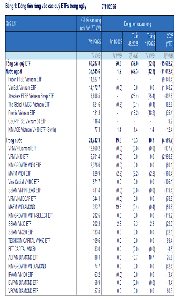 Tháng 11/2025, các quỹ ETF ghi nhận bị rút ròng 32 tỷ đồng, nâng tổng giá trị rút ròng từ đầu năm 2025 lên hơn 15,6 nghìn tỷ đồng.