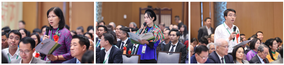 Các đại biểu (từ trái sang) Phạm Thị Lý, Vương Thị Thương, Phạm Đức Trọng nêu đề xuất tại Hội nghị - Ảnh: VGP/Nhật Bắc.