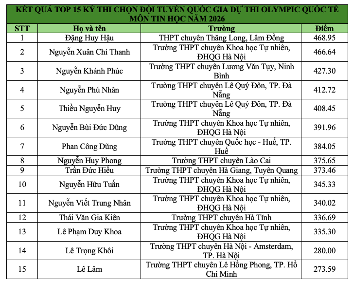 Sau hai ngày thi đấu căng thẳng, Top 15 học sinh xuất sắc nhất vòng tuyển chọn đội tuyển quốc gia dự thi Olympic quốc tế môn Tin học năm 2026 đã chính thức lộ diện. Đặng Huy Hậu, học sinh Trường THPT chuyên Thăng Long (Lâm Đồng) dẫn đầu bảng xếp hạng, trong khi nhiều gương mặt đến từ các địa phương ngoài trung tâm tiếp tục tạo dấu ấn nổi bật.