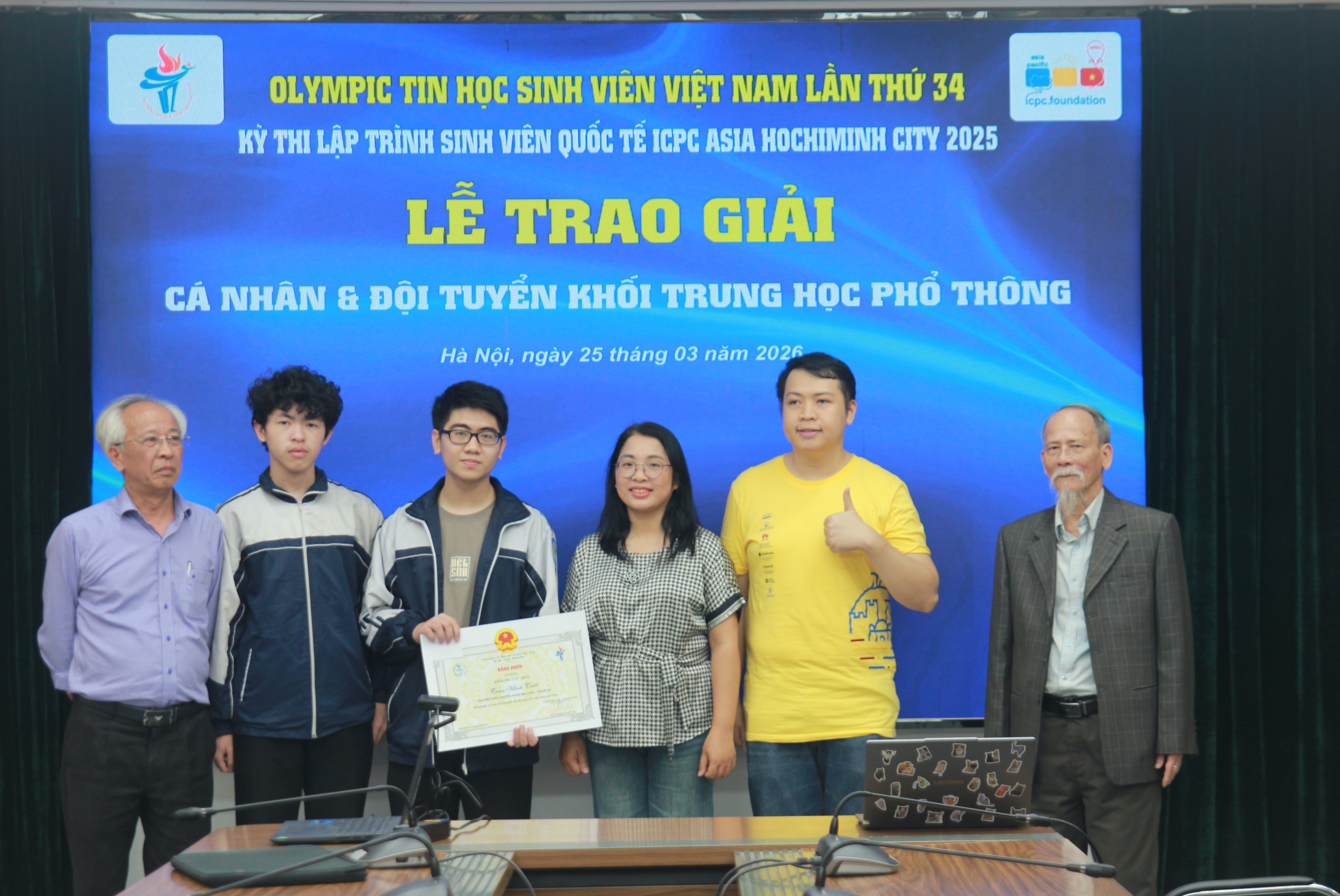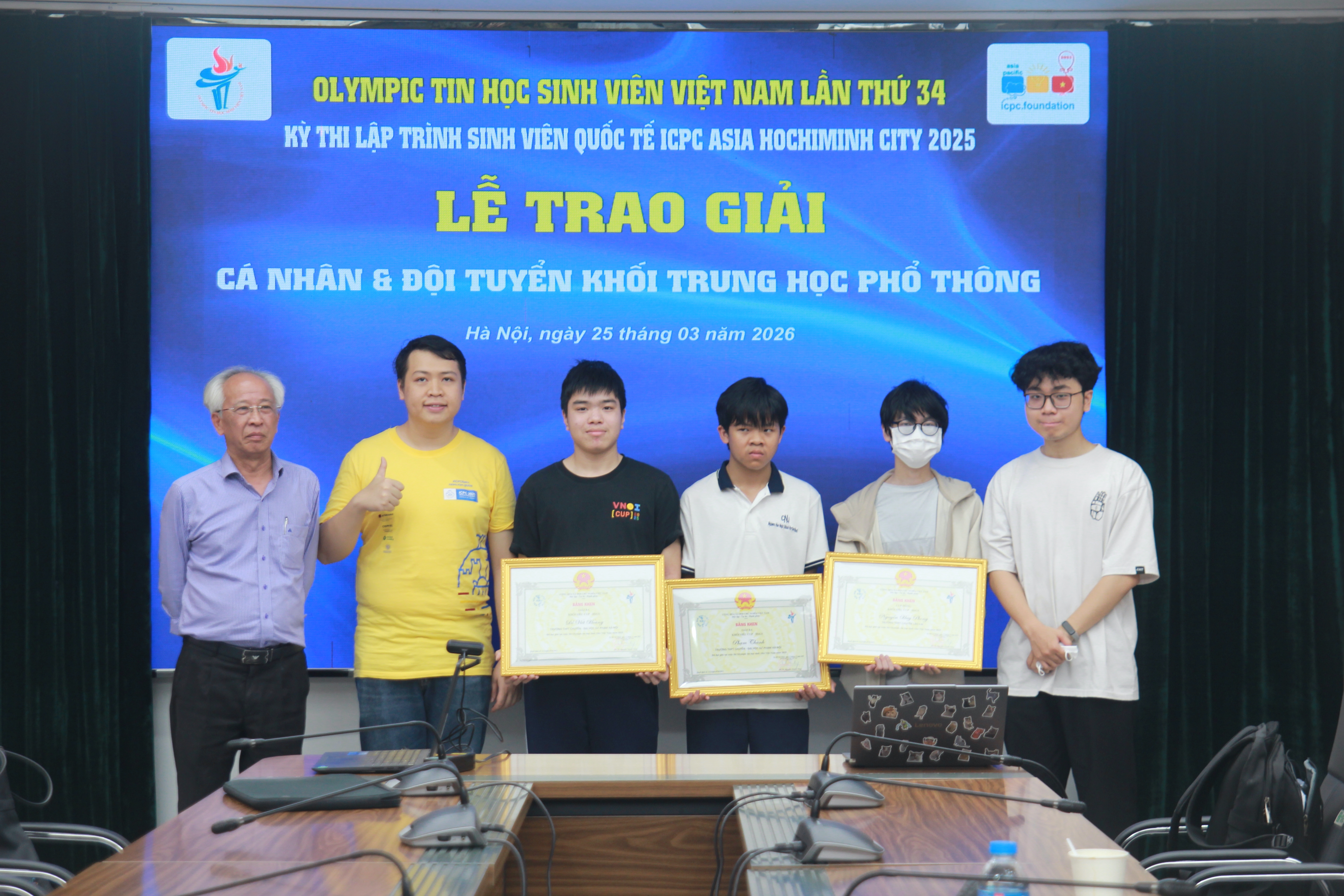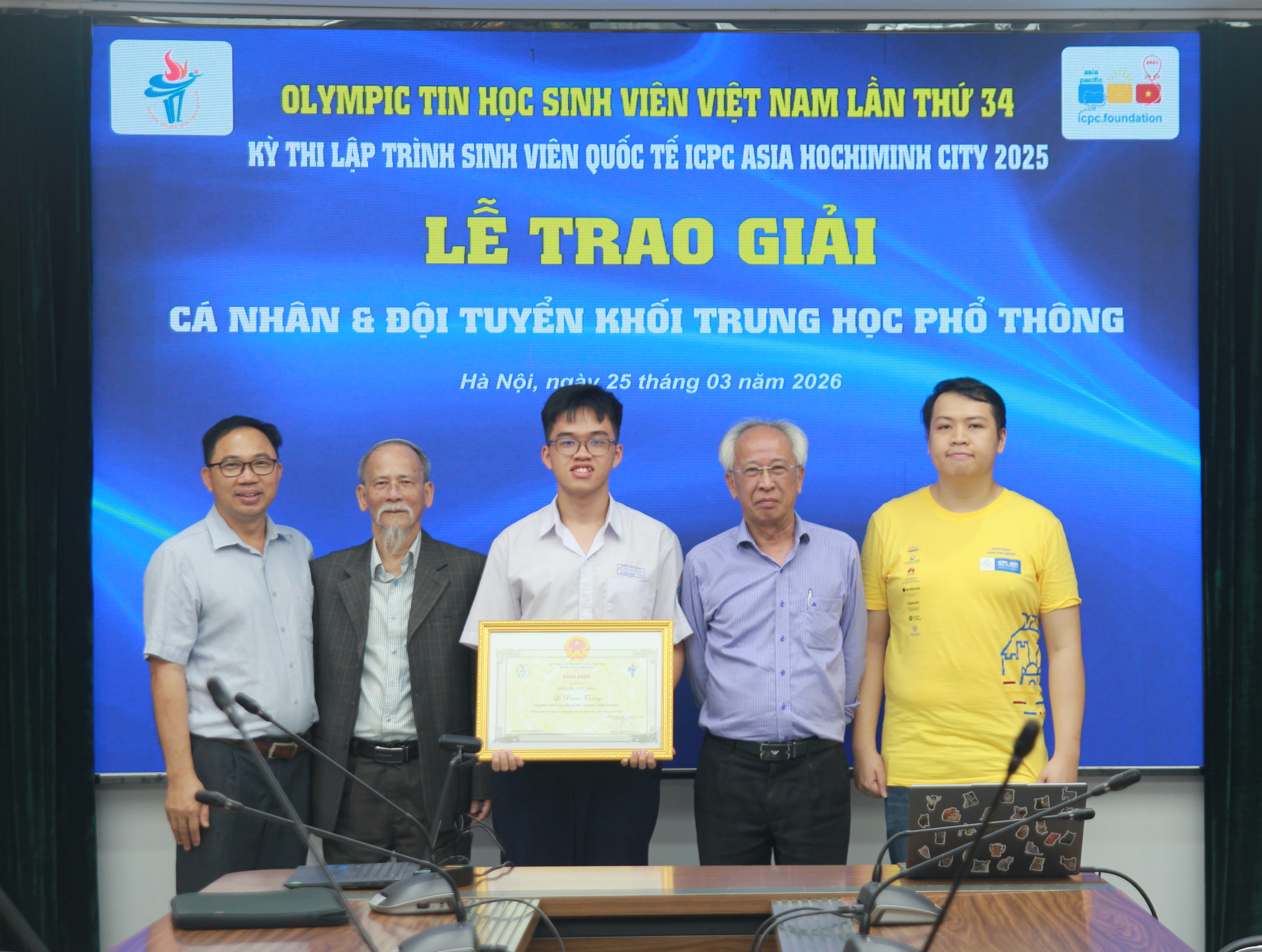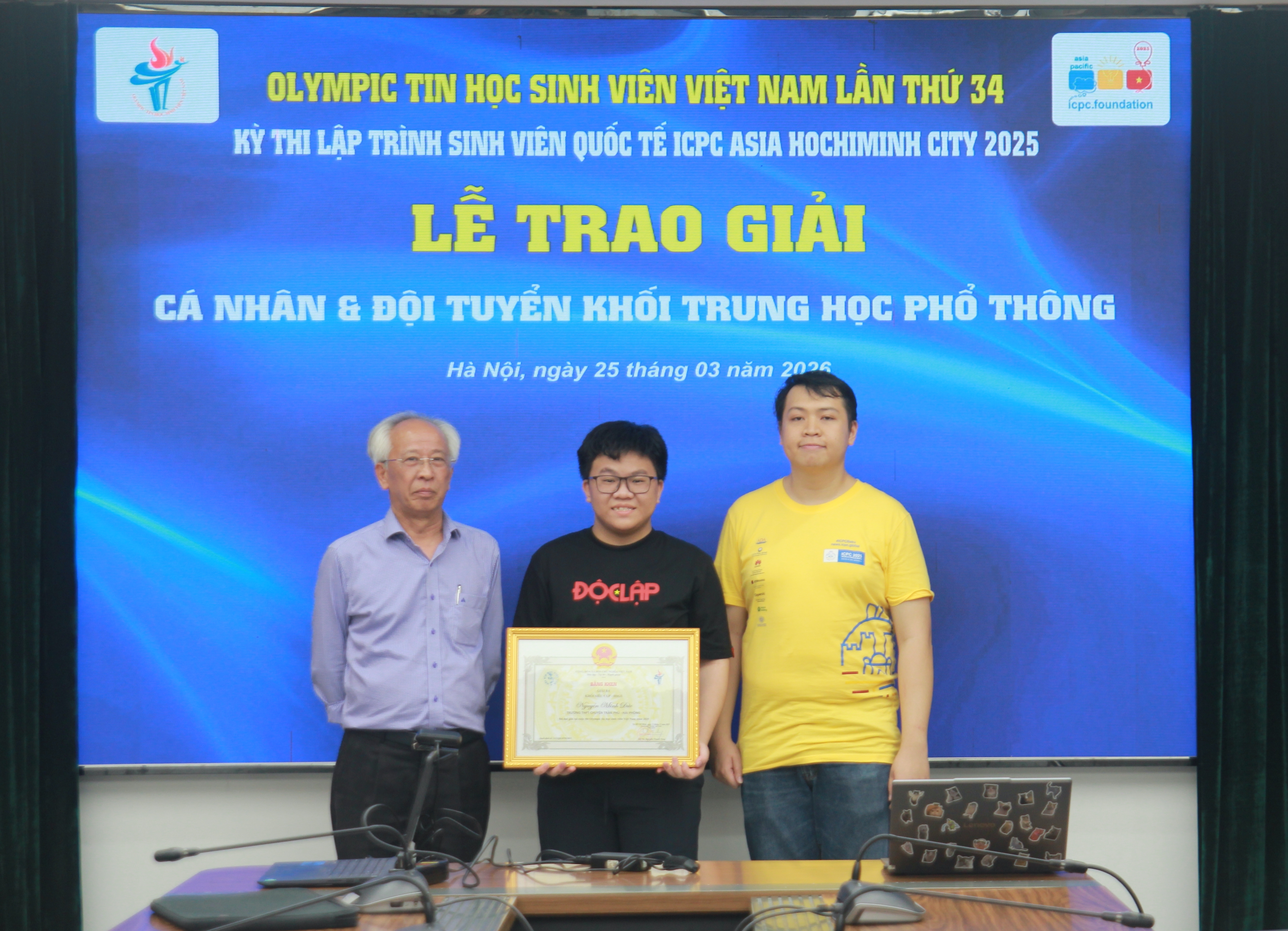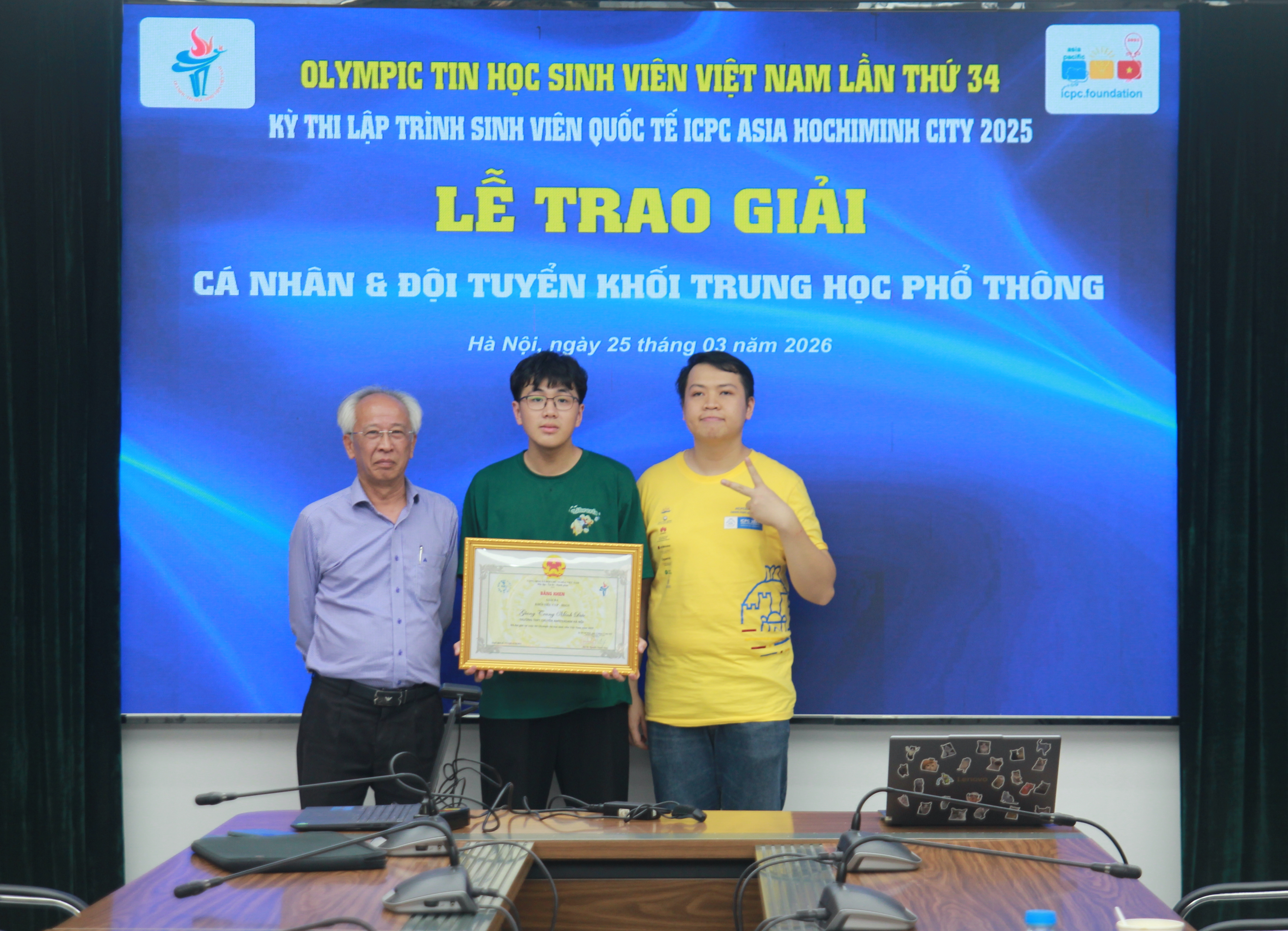 Trước đó, ngày 25/3, Hội Tin học Việt Nam và ICPC Việt Nam đã trao giải thưởng cho các học sinh xuất sắc đạt thành tích tại Siêu CUP OLP’25, Kỳ thi ICPC Quốc gia và ICPC Asia HoChiMinh City 2025 nhằm khích lệ tinh thần trước vòng tuyển chọn. Tham dự Lễ trao giải có ông Nguyễn Long Chủ tịch ICPC Việt Nam, đồng Giám đốc ICPC Asia Pacific; PGS.TS.NGND Hồ Sĩ Đàm; anh Phạm Văn Hạnh, Phó Chủ tịch Câu lạc bộ Tin học sinh viên Việt Nam cùng các thầy, cô giáo và các em học sinh.