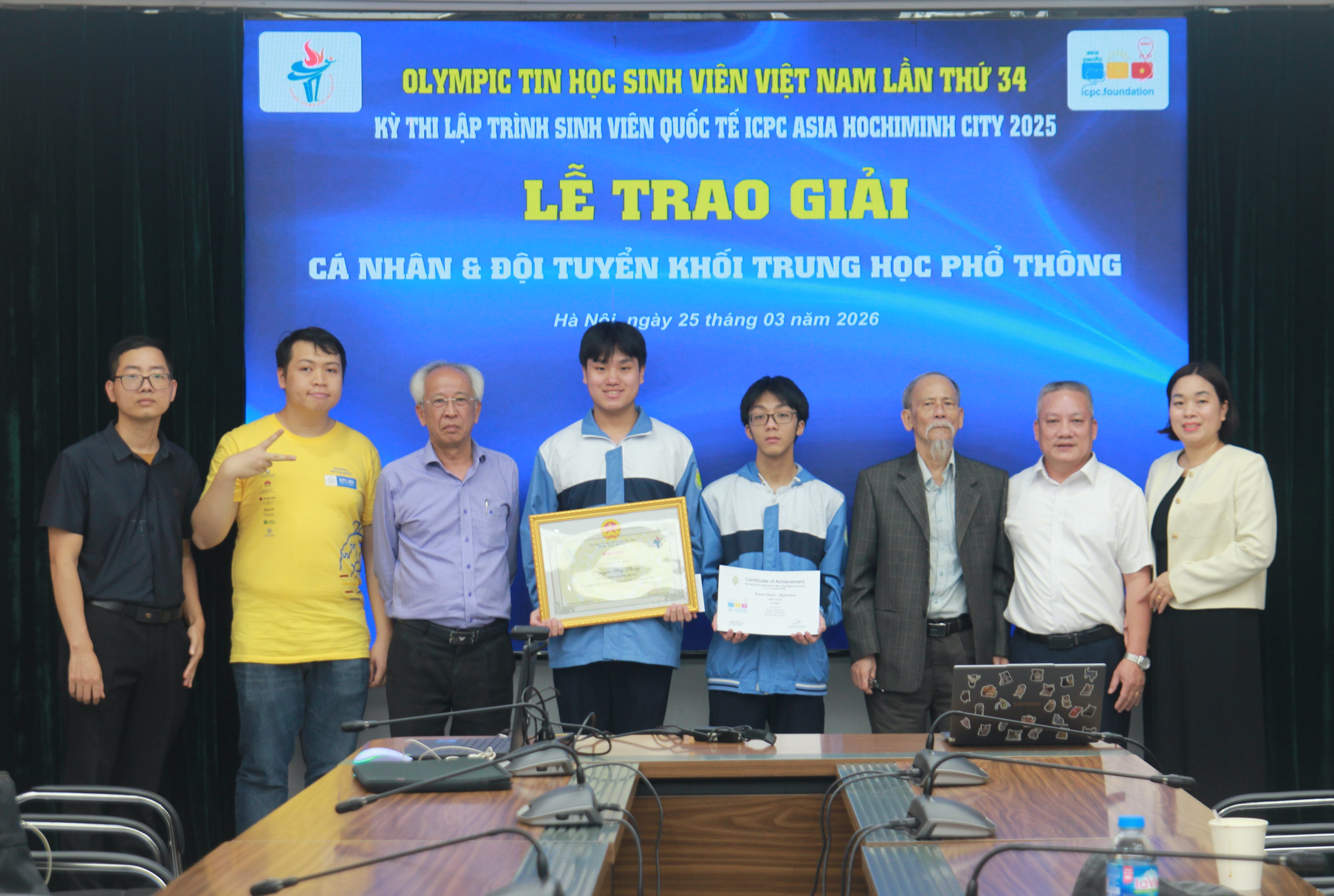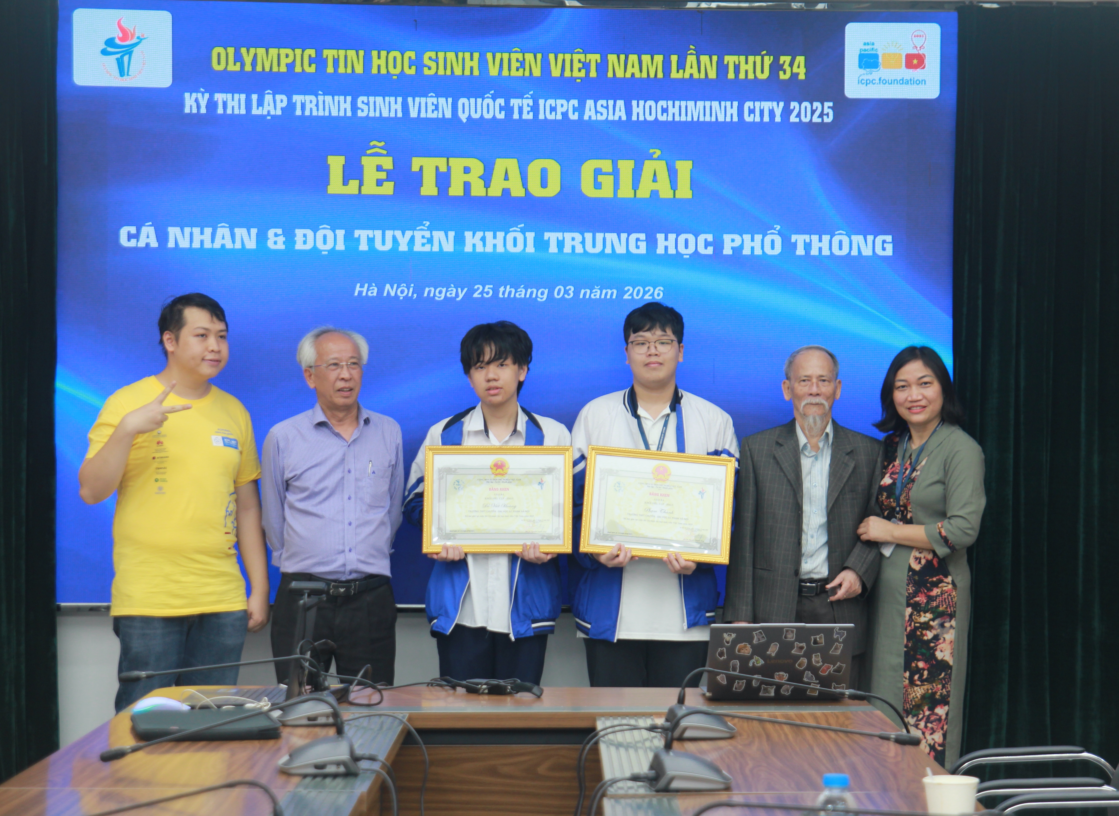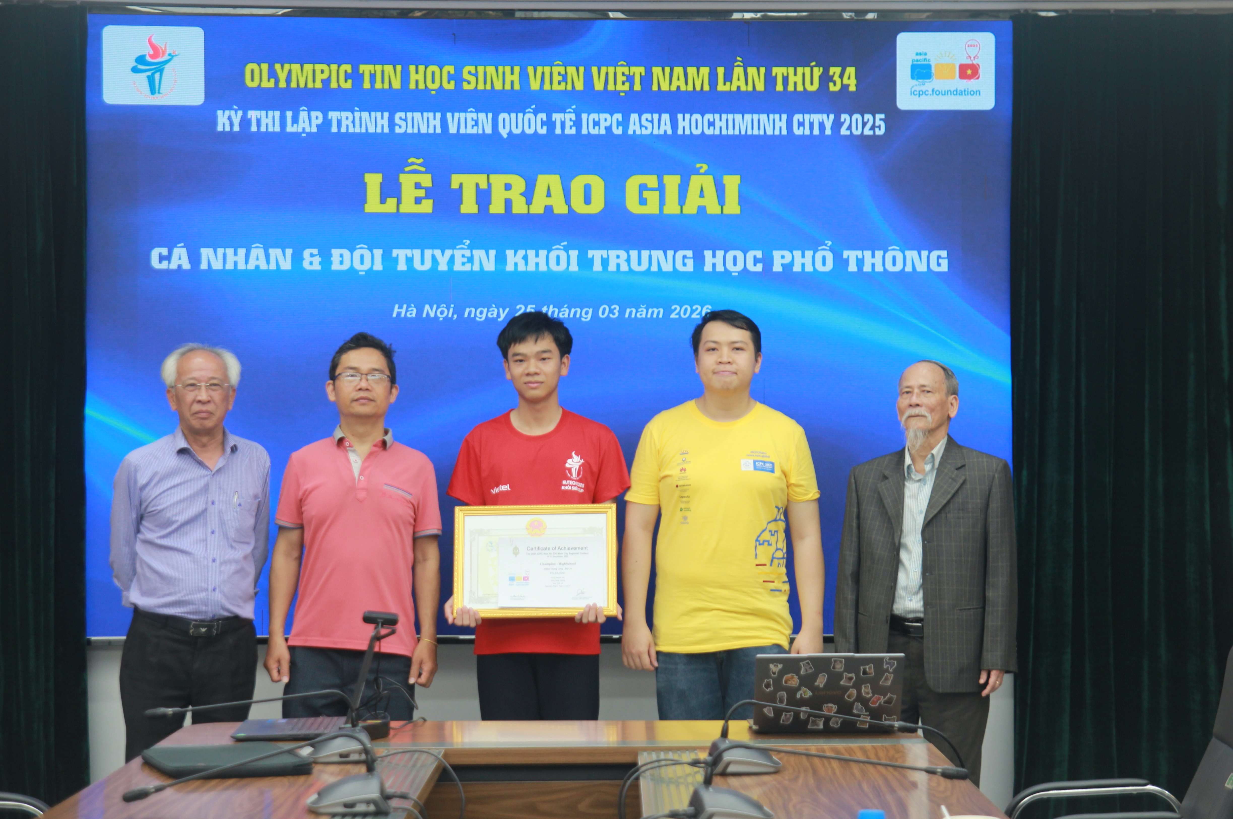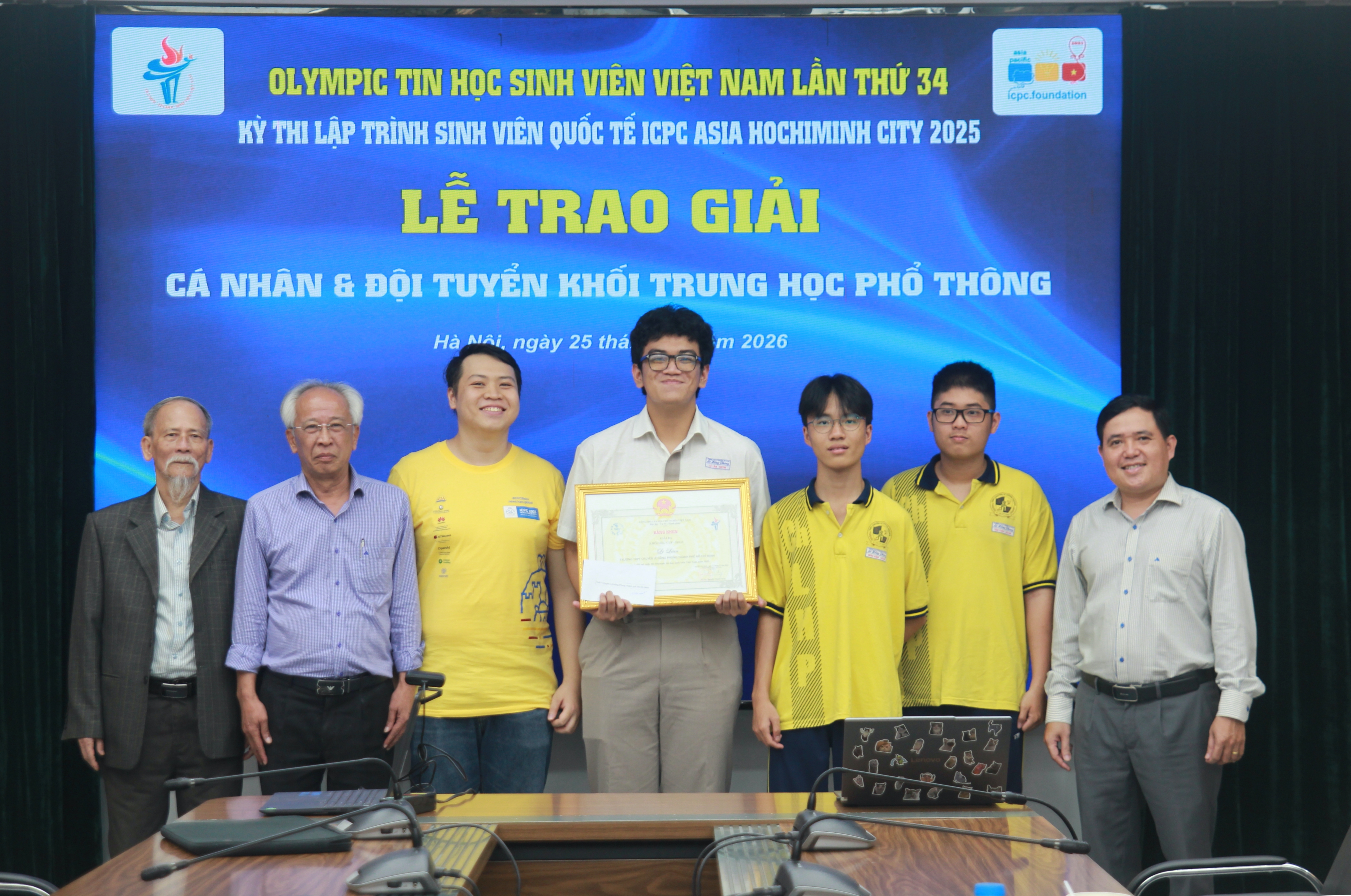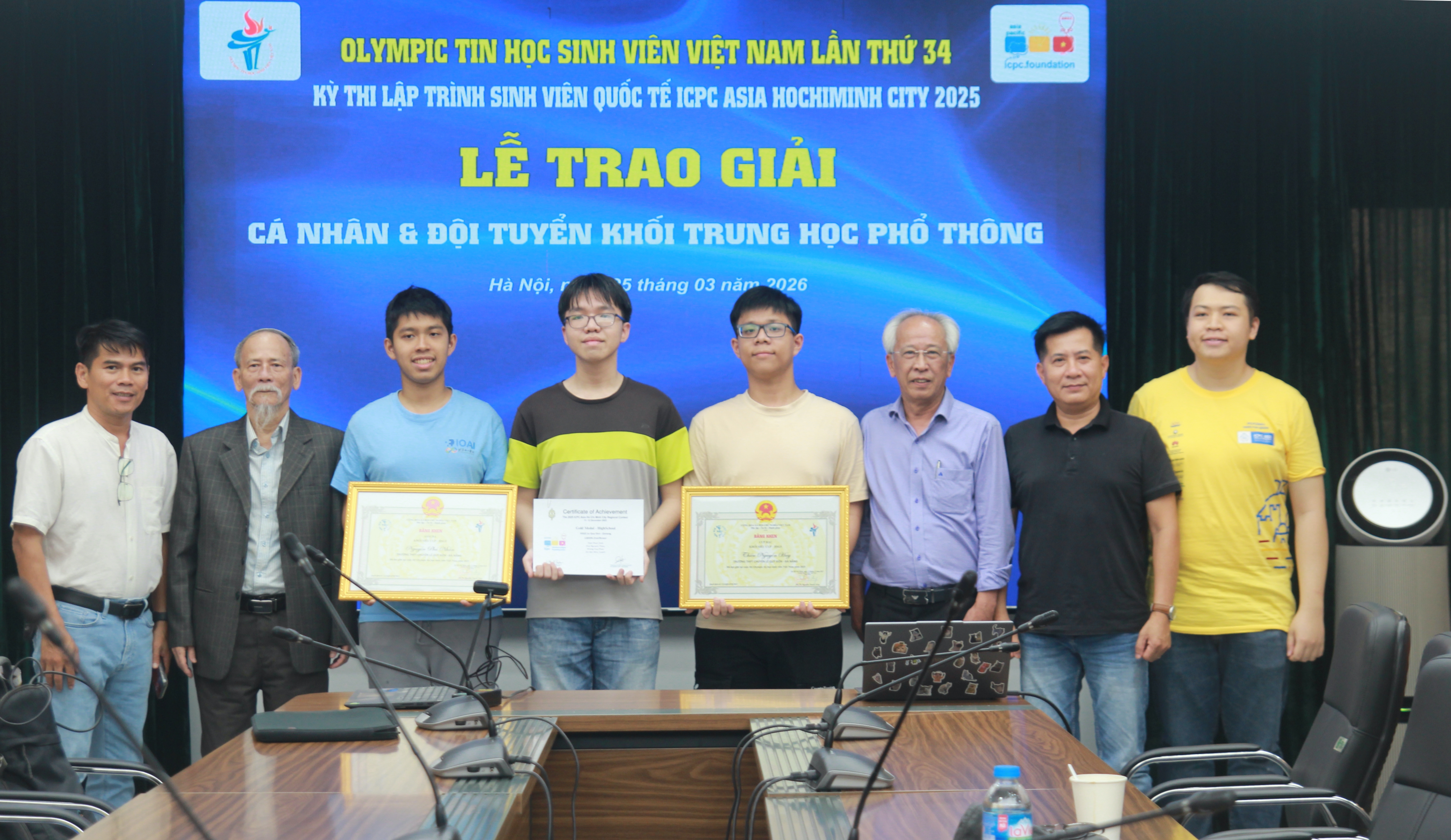 Trước đó, ngày 25/3, Hội Tin học Việt Nam và ICPC Việt Nam đã trao giải thưởng cho các học sinh xuất sắc đạt thành tích tại Siêu CUP OLP’25, Kỳ thi ICPC Quốc gia và ICPC Asia HoChiMinh City 2025 nhằm khích lệ tinh thần trước vòng tuyển chọn. Tham dự Lễ trao giải có ông Nguyễn Long Chủ tịch ICPC Việt Nam, đồng Giám đốc ICPC Asia Pacific; PGS.TS.NGND Hồ Sĩ Đàm; anh Phạm Văn Hạnh, Phó Chủ tịch Câu lạc bộ Tin học sinh viên Việt Nam cùng các thầy, cô giáo và các em học sinh.