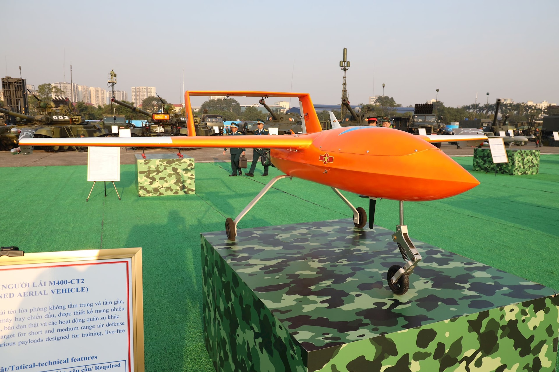 Máy bay không người lái M400-CT2. Sử dụng làm mục tiêu bay cho khí tài tên lửa phòng không tầm trung và gần, làm mục tiêu chặn kích cho máy bay chiến đấu, được thiết kế mang nhiều loại tải có ích cho phục vụ công tác huấn luyện, bắn đạn thật và các hoạt động quân sự khác. Ảnh: baoquankhu7.vn.