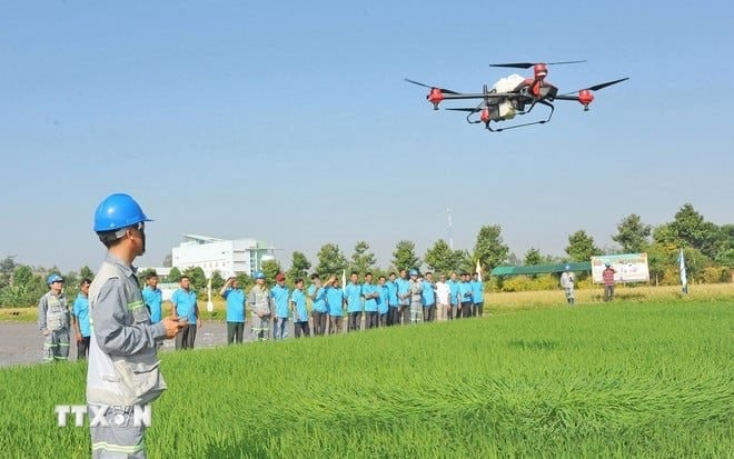 Nông dân tham quan mô hình máy bay không người lái bón phân và phun thuốc trừ sâu cho cây lúa. (Ảnh: TTXVN).
