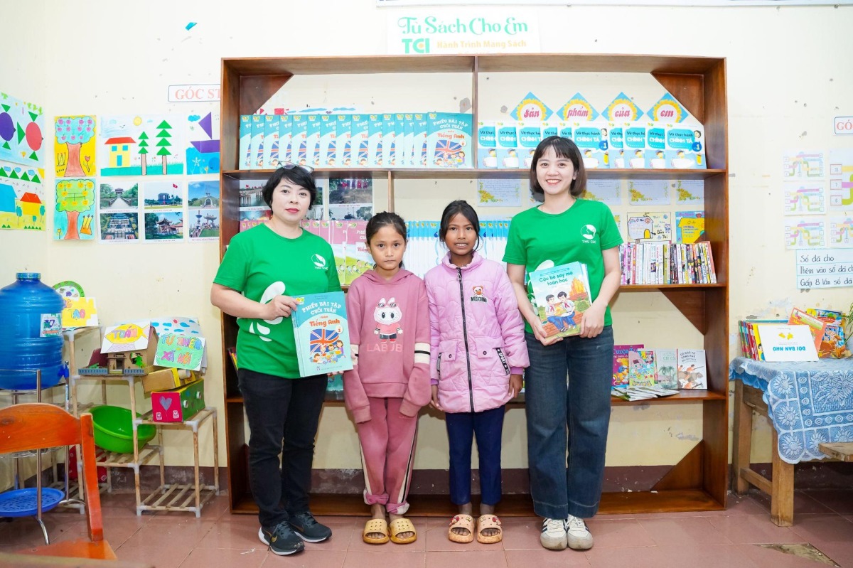 Trong chương trình, đoàn đã gửi tặng một tủ sách mới gồm truyện tranh, sách khoa học, kỹ năng sống, sách song ngữ và tài liệu bổ trợ dành cho thầy cô.