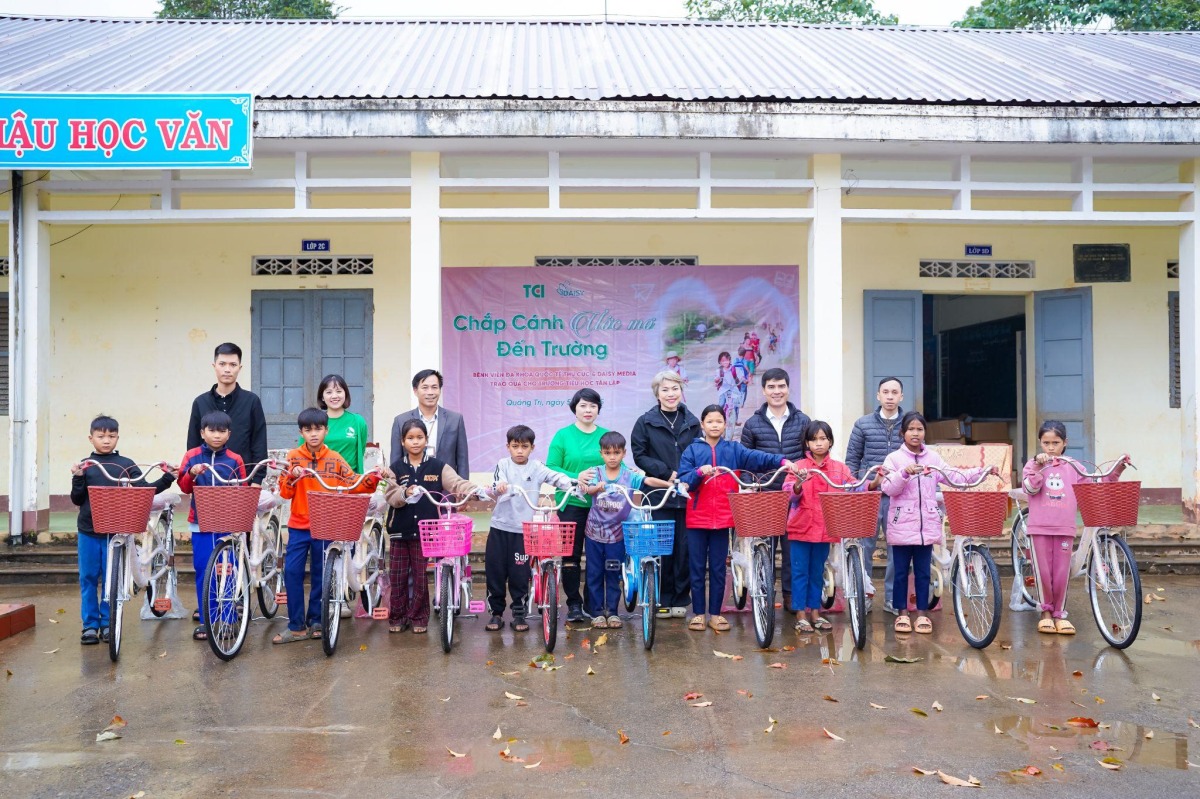 Đoàn thiện nguyện của Bệnh viện Thu Cúc, AloBacsi và Daisy Media vừa tặng tủ sách và xe đạp cho học sinh điểm trường Bản Bù (Trường Tiểu học Tân Lập, Quảng Trị), góp phần hỗ trợ việc học của trẻ em vùng biên trong điều kiện còn nhiều thiếu thốn.