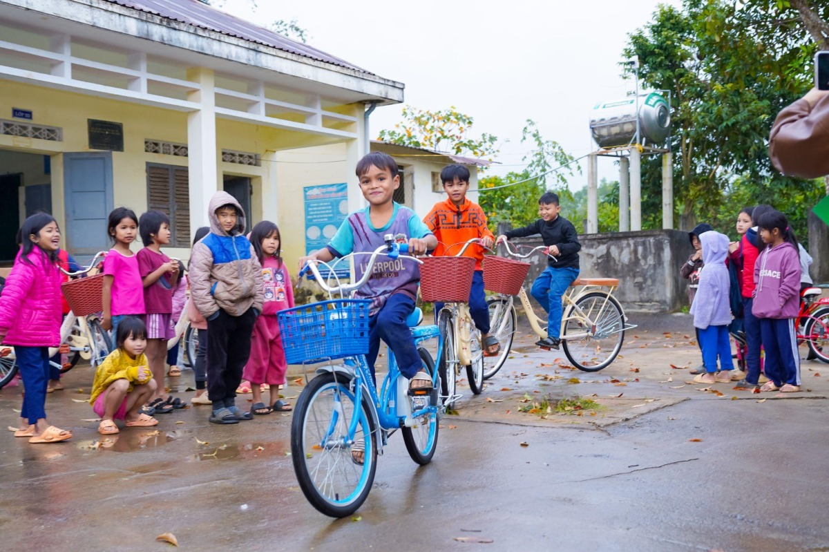 Bên cạnh tủ sách, đoàn cũng trao tặng 10 chiếc xe đạp cho những học sinh có hoàn cảnh khó khăn, nhà xa hoặc phải đi bộ quãng đường dài mỗi ngày để tới lớp. Lúc được thầy cô lần lượt gọi tên lên nhận xe, ban đầu các em còn rụt rè, nhưng sau đó không giấu được niềm vui khi được sở hữu phương tiện mới. Với học sinh vùng cao, xe đạp là trợ giúp quan trọng giúp các em duy trì việc đến lớp đều đặn, đặc biệt trong mùa mưa lạnh.