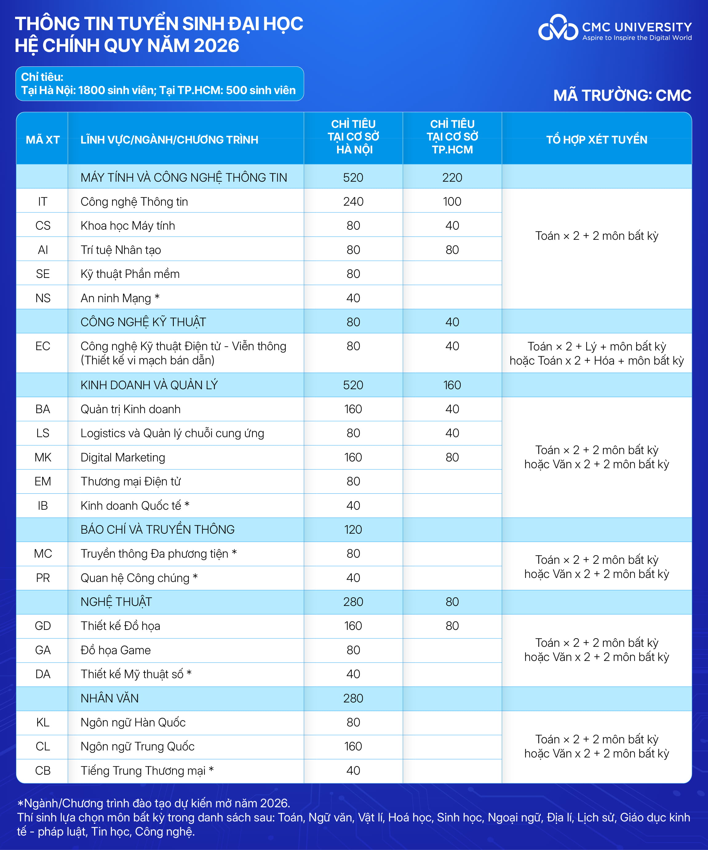 Năm 2026, Trường Đại học CMC chính thức thành lập cơ sở đào tạo tại TP.HCM, dự kiến tuyển sinh 2300 chỉ tiêu cho 19 ngành và chương trình đào tạo trên cả nước. Nhà trường tiếp tục duy trì quỹ học bổng “CMC - Vì bạn xứng đáng” trị giá 96 tỷ đồng cùng chương trình tặng máy tính bảng ipad cho tất cả tân sinh viên nhập học.