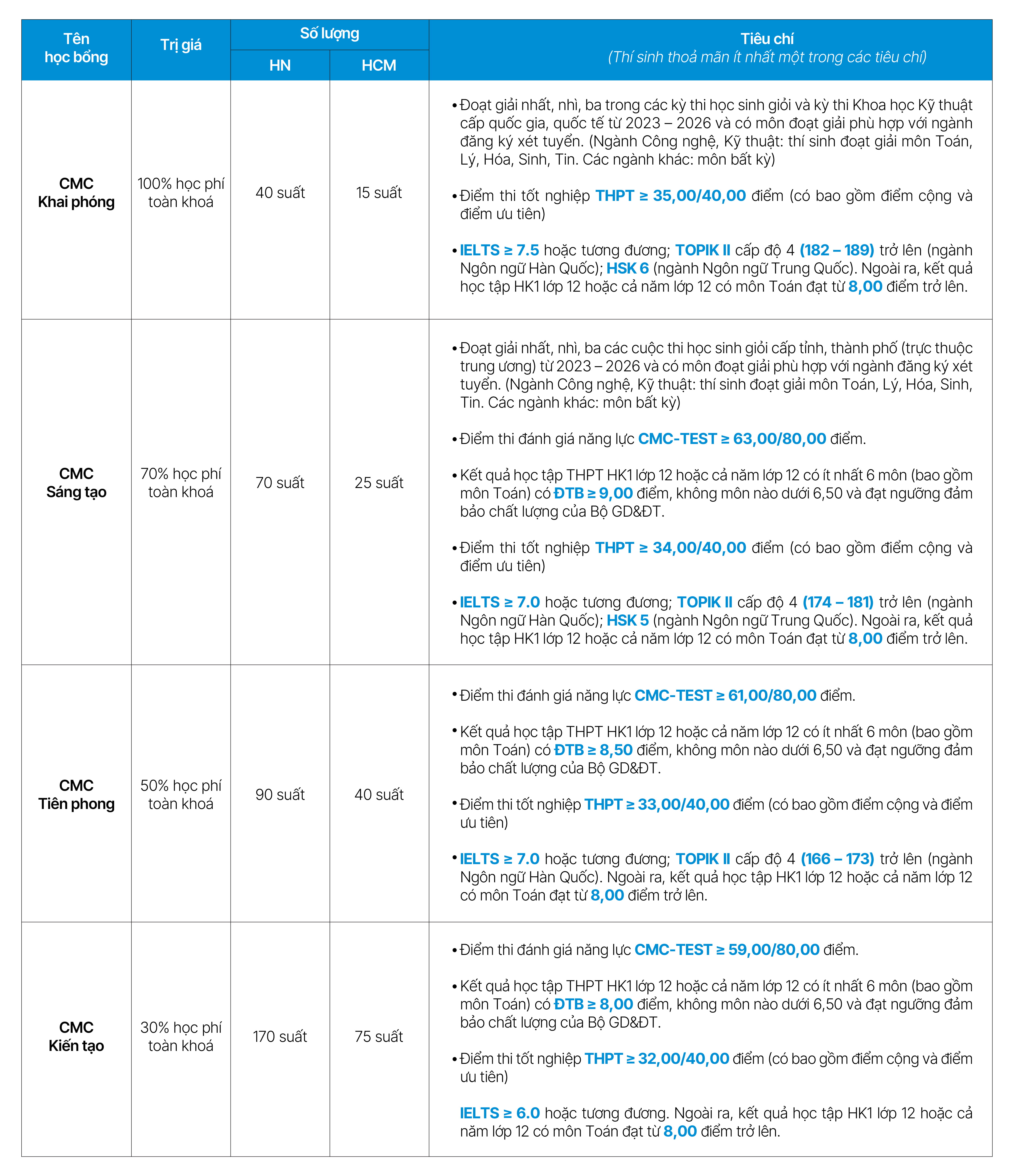 Trong năm 2026, Trường Đại học CMC tiếp tục duy trì quỹ học bổng “CMC - Vì bạn xứng đáng” trị giá 96 tỷ đồng dành cho thí sinh có thành tích học tập xuất sắc, nhằm phát triển nguồn nhân lực chất lượng cao tại Việt Nam. Trong đó, dự kiến cơ sở Hà Nội có 370 suất học bổng, cơ sở Hồ Chí Minh có 155 suất với các mức từ 30%-100% học phí toàn bộ các năm học.