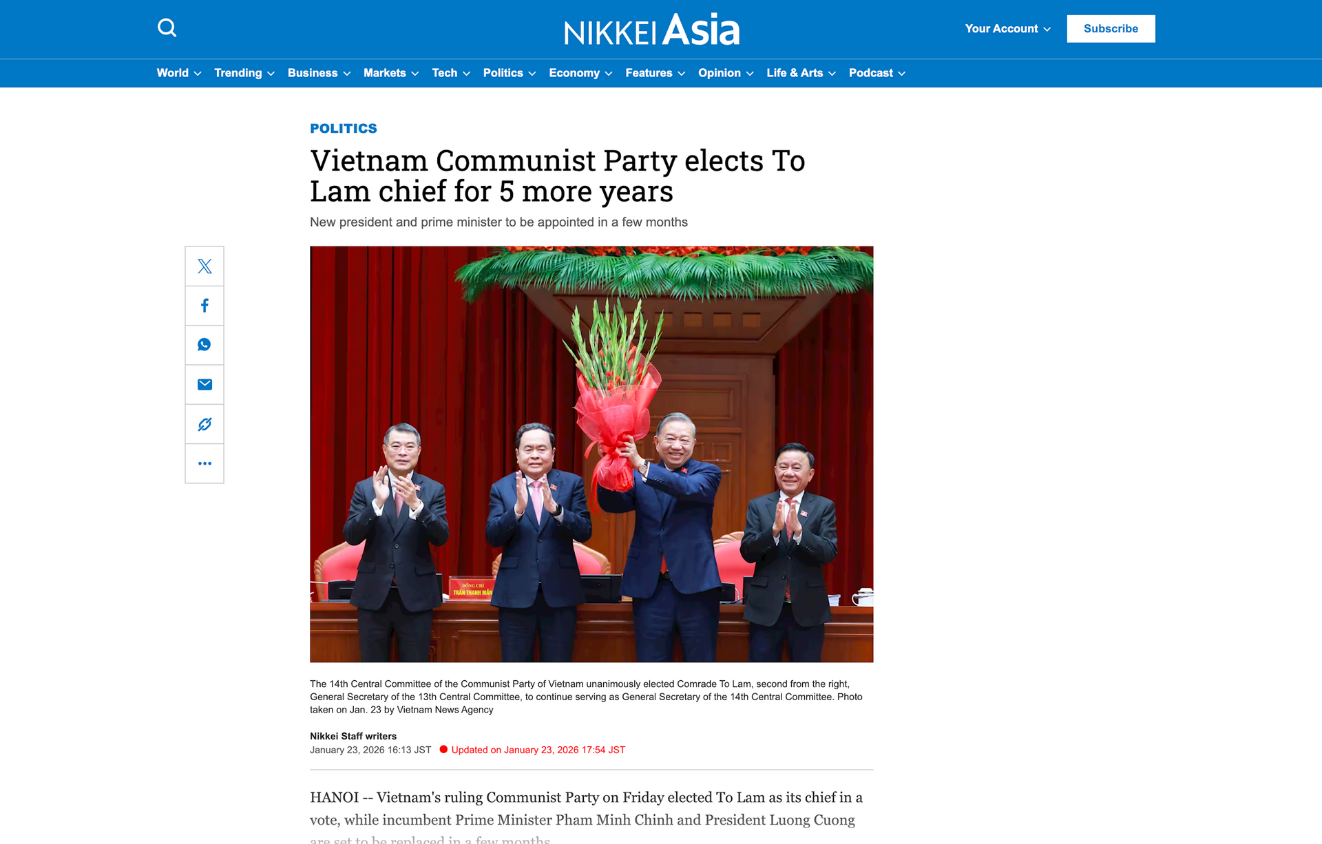 Nikkei (Nhật Bản) đưa tin về ngày làm việc cuối cùng của Đại hội XIV. Ảnh chụp màn hình.