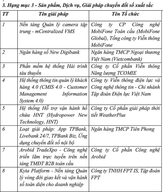 Theo Ban tổ chức, các hạng mục đạt giải thưởng năm nay tiếp tục phản ánh sức sáng tạo mạnh mẽ, khả năng ứng dụng công nghệ hiện đại như trí tuệ nhân tạo (AI), dữ liệu lớn, Internet vạn vật (IoT) hay chuỗi khối (Blockchain) vào thực tiễn.