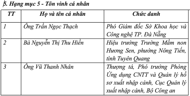 Điểm nhấn nổi bật của Giải thưởng năm nay là lần đầu tiên bổ sung hạng mục vinh danh cá nhân, nhằm tôn vinh những gương mặt có đóng góp lớn cho công cuộc chuyển đổi số quốc gia. Họ là những người đã có công trình, sáng kiến và hoạt động nổi bật, thể hiện rõ vai trò "con người là trung tâm của chuyển đổi số".