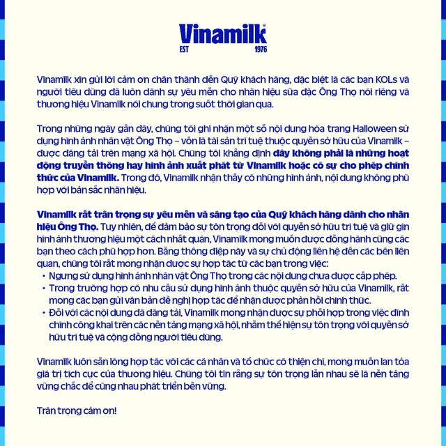 “Vinamilk rất trân trọng sự yêu mến và sáng tạo của Quý khách hàng dành cho nhãn hiệu Ông Thọ. Tuy nhiên, để đảm bảo sự tôn trọng đối với quyền sở hữu trí tuệ và giữ gìn hình ảnh thương hiệu một cách nhất quán, Vinamilk mong muốn được đồng hành cùng các bạn theo cách phù hợp hơn”, văn bản nêu.