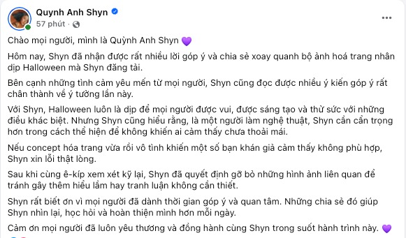 Cô cho biết đã “nhận được rất nhiều góp ý và chia sẻ xoay quanh bộ ảnh hoá trang nhân dịp Halloween” và “rất trân trọng những ý kiến đóng góp”. Quỳnh Anh Shyn khẳng định Halloween là dịp cô thể hiện sự sáng tạo nghệ thuật, nhưng thừa nhận một số hình ảnh có thể khiến khán giả “cảm thấy không phù hợp”.