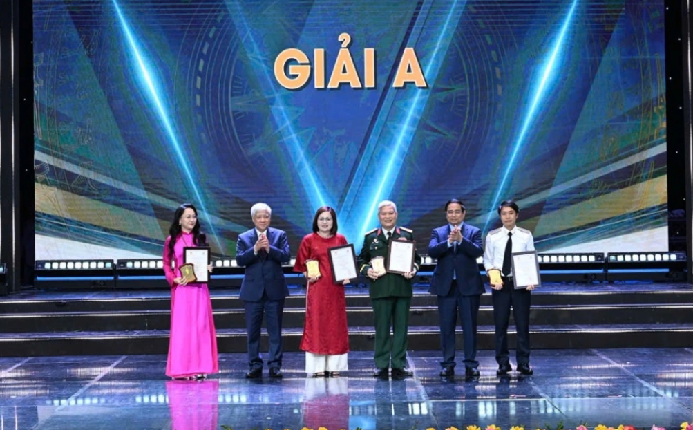 Thủ tướng Chính phủ Phạm Minh Chính và Chủ tịch Ủy ban Trung ương Mặt trận Tổ quốc Việt Nam Đỗ Văn Chiến trao giải cho tác giả/nhóm tác giả đoạt Giải A. Ảnh: Trang Linh
