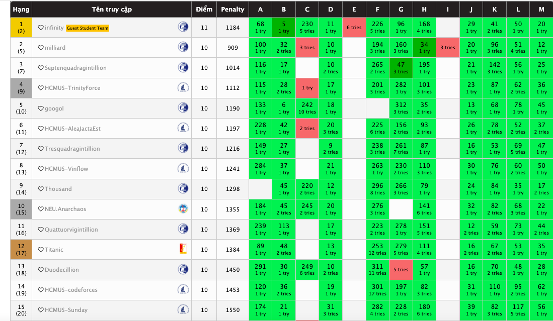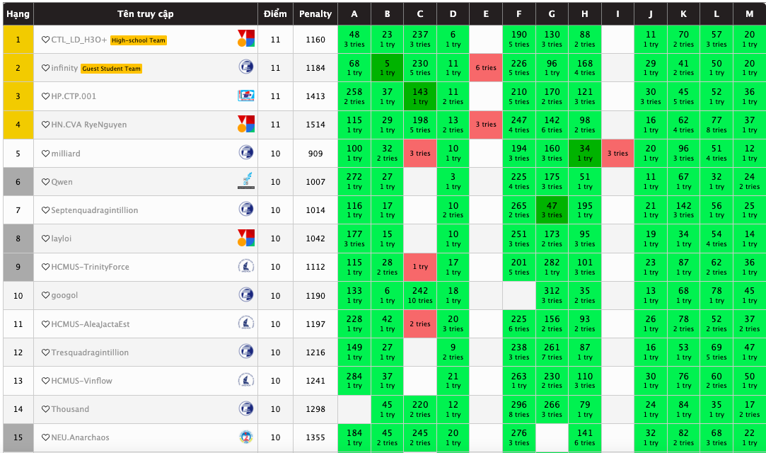 Sau 02 giờ thi đấu, bảng xếp hạng tạm thời chứng kiến đội infinity (ĐH Công nghệ - ĐHQG Hà Nội) vươn lên dẫn đầu nhóm đại học với chuỗi giải bài ổn định và tốc độ xử lý ấn tượng.